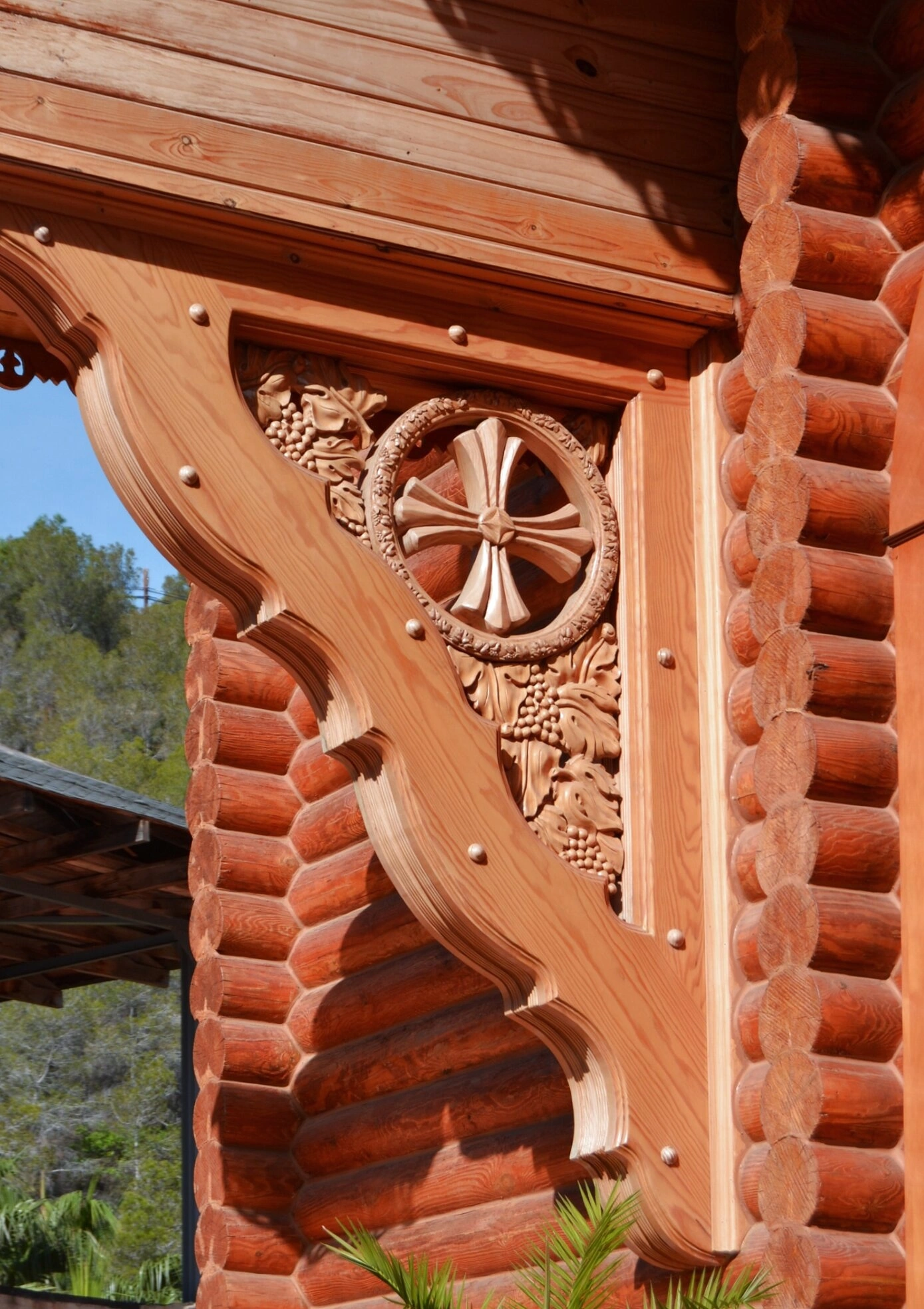 Данный декоративный элемент представляет собой часть кронштейна, или мénsula, который поддерживает кровлю над входом или навес. Тщательная проработка деталей, плавность линий и глубокая символика свидетельствуют о высоком мастерстве резчиков и осмысленном подходе к украшению дома Божия. Резьба выполнена на массивном бревне сруба, что характерно для традиционной русской архитектуры, привнесённой на испанскую землю.