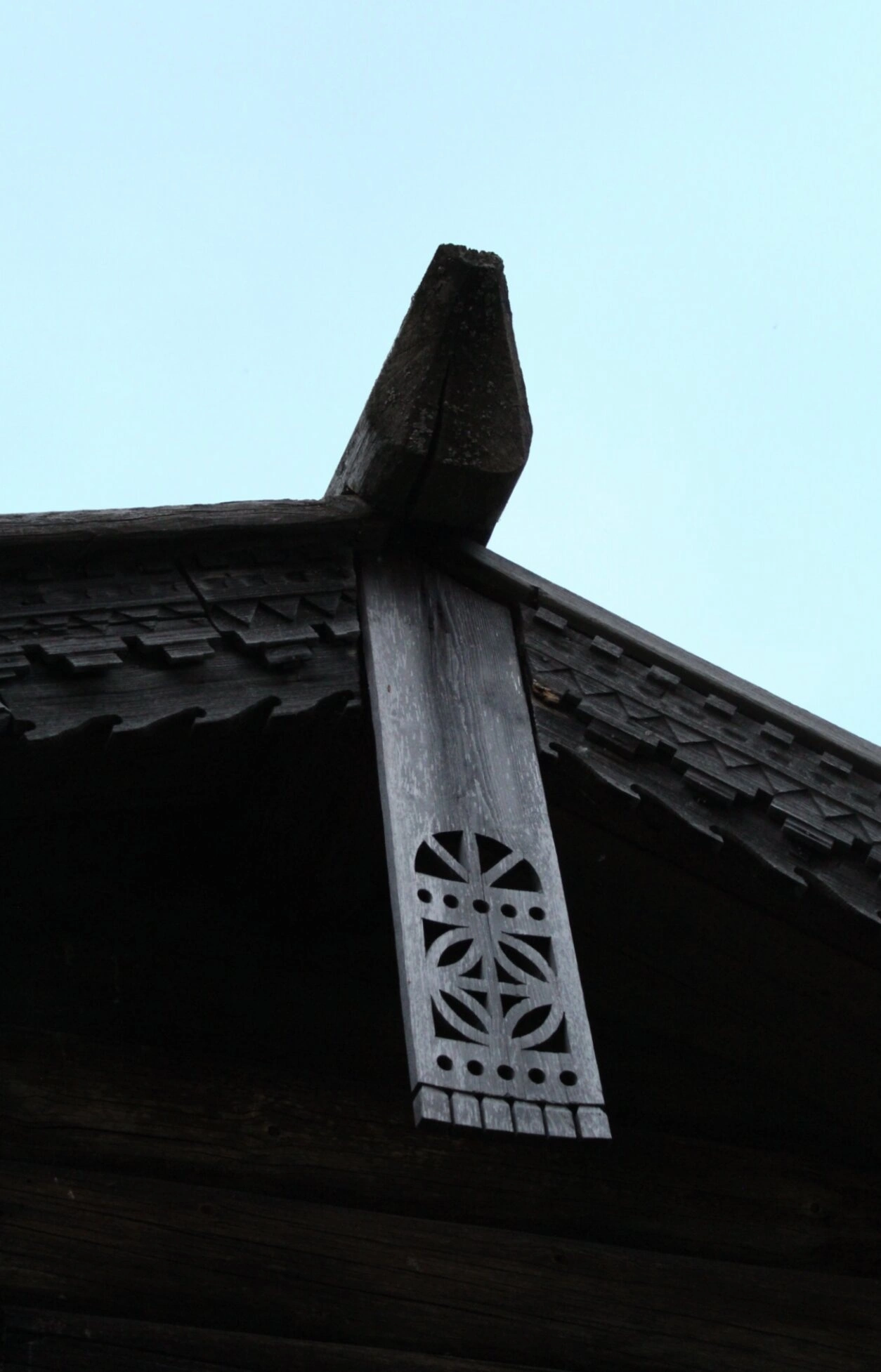 На представленной фотографии запечатлён уникальный элемент внешнего убранства храма преподобного Александра Свирского, расположенного в деревне Космозеро на берегу одноимённого озера. Изображённый объект является традиционным для русского деревянного зодчества резным полотенцем — декоративной доской, украшающей свес кровли.