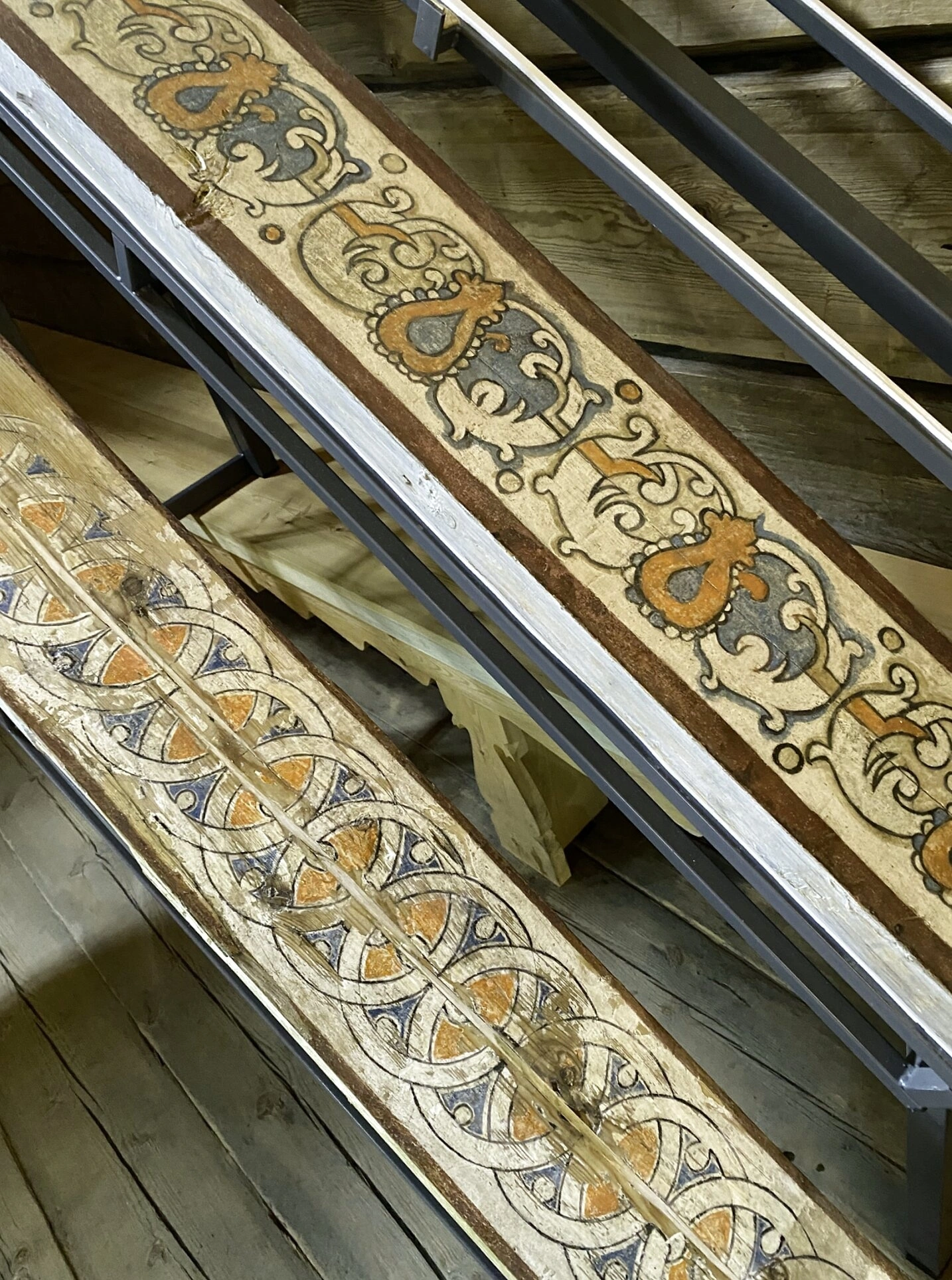 В центре кадра расположены две мощные декоративные балки, пересекающие его по диагонали. Они являются не только конструктивным элементом, но и важной частью благолепного убранства церковного интерьера, где каждая деталь наполнена символическим смыслом. Поверхность балок украшена глубокой и выразительной резьбой, в которой переплетаются геометрические и стилизованные растительные мотивы. Эти узоры — не просто украшение, а продолжение древней традиции, где орнамент служит формой благодарения Творца за дарованные таланты.