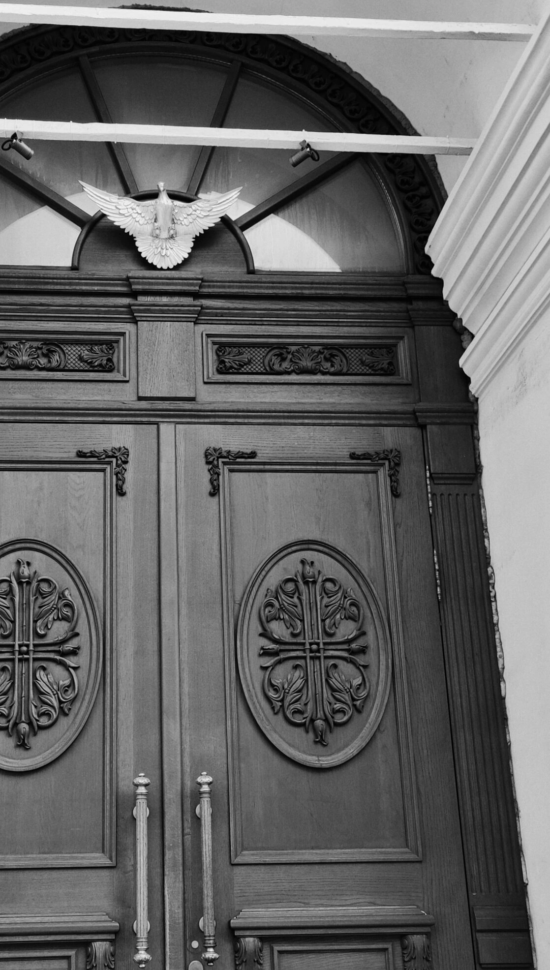 В верхней части композиции, в тимпане над дверьми, изображён голубь – классический символ Святого Духа, означающий мир, чистоту и божественное благословение. Центральными элементами декора створок являются крупные круглые медальоны с изысканным крестообразным орнаментом. Данный узор символизирует Крест Господень – основу христианской веры, орудие спасения и победы над смертью.