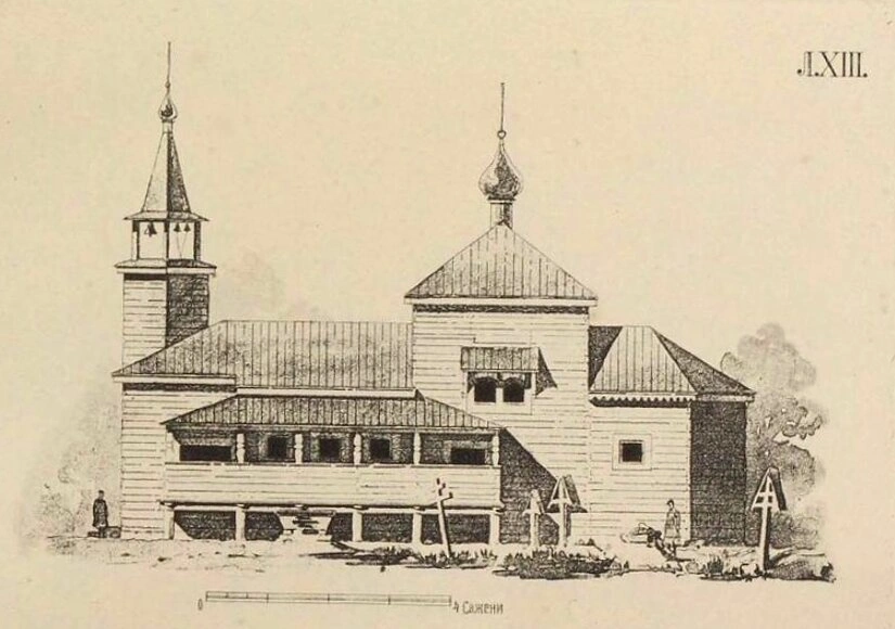 Храмовая постройка, изображённая на чертеже, представляет собой классический образец русского деревянного зодчества. Чётко просматривается основная клеть храма, увенчанная главкой, а также отдельно стоящая шатровая колокольня, что было характерно для церковной архитектуры данного региона. Наличие подписи «А Сажени» указывает на то, что рисунок выполнен в определённом масштабе, что подчёркивает его чертёжный, документальный характер и позволяет судить о реальных размерах сооружения.