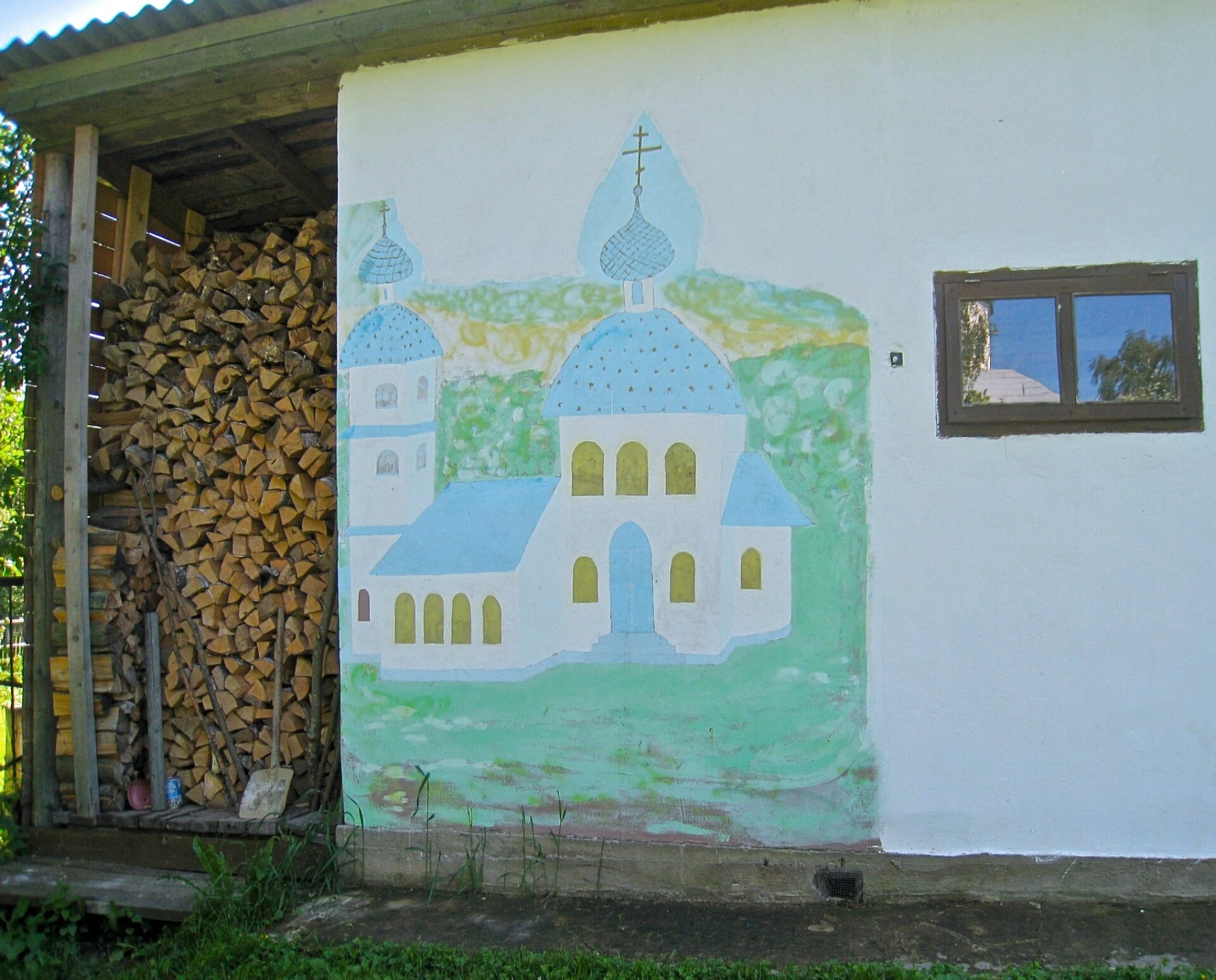 Слева от здания с росписью расположена аккуратно сложенная поленница дров, что свидетельствует о хозяйственной деятельности при храме. Наличие дровяного запаса под отдельным навесом указывает на заботу о подготовке к отопительному сезону, что особенно важно для обеспечения тепла в церковных помещениях в зимний период.