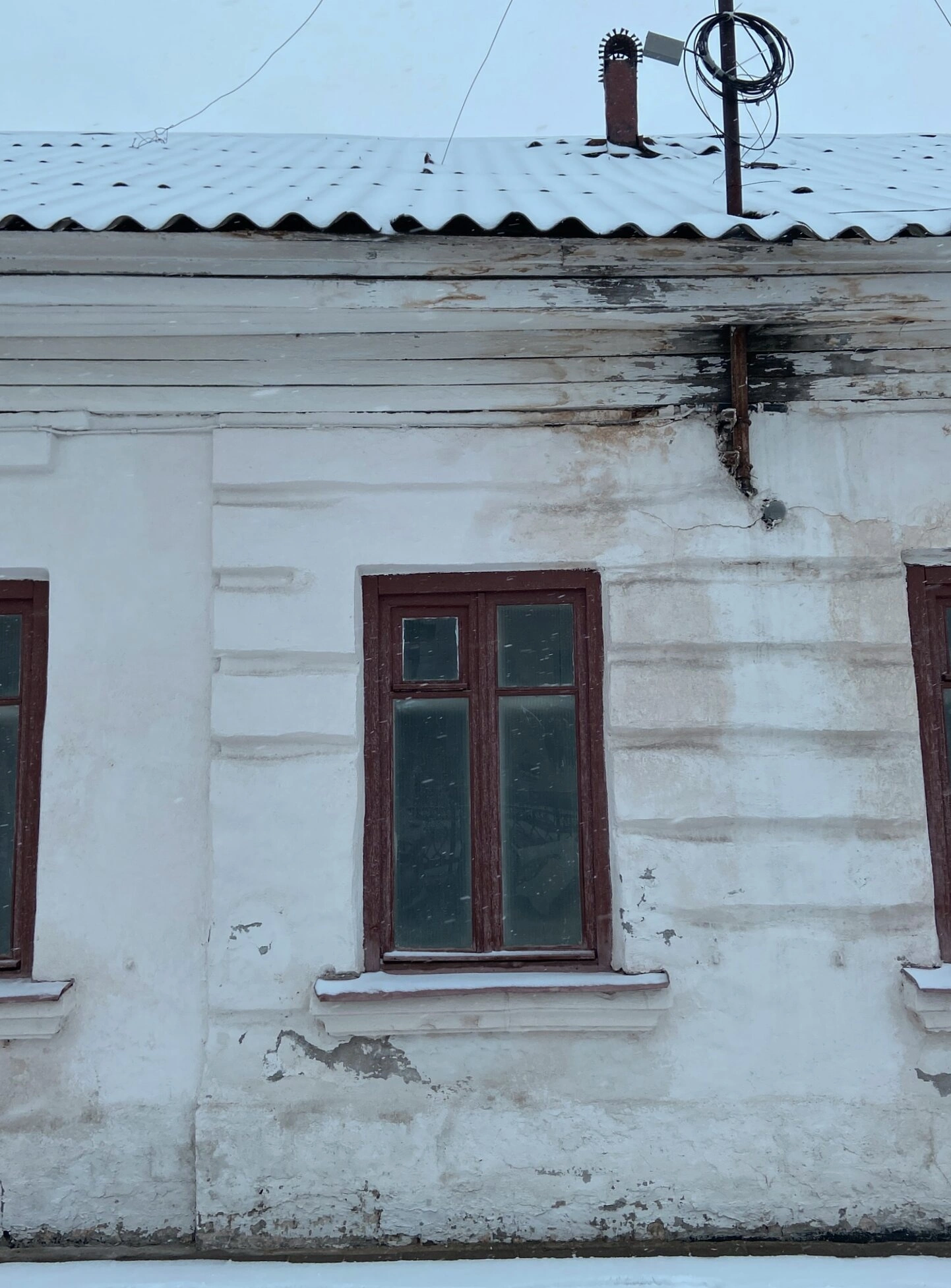 В верхней части композиции виден фрагмент кровли с волнистым белым покрытием, что свидетельствует о более поздних ремонтных работах. На стене слева заметны элементы современной инфраструктуры — электрические провода на кронштейне, что указывает на приспособление исторического здания под современные нужды.