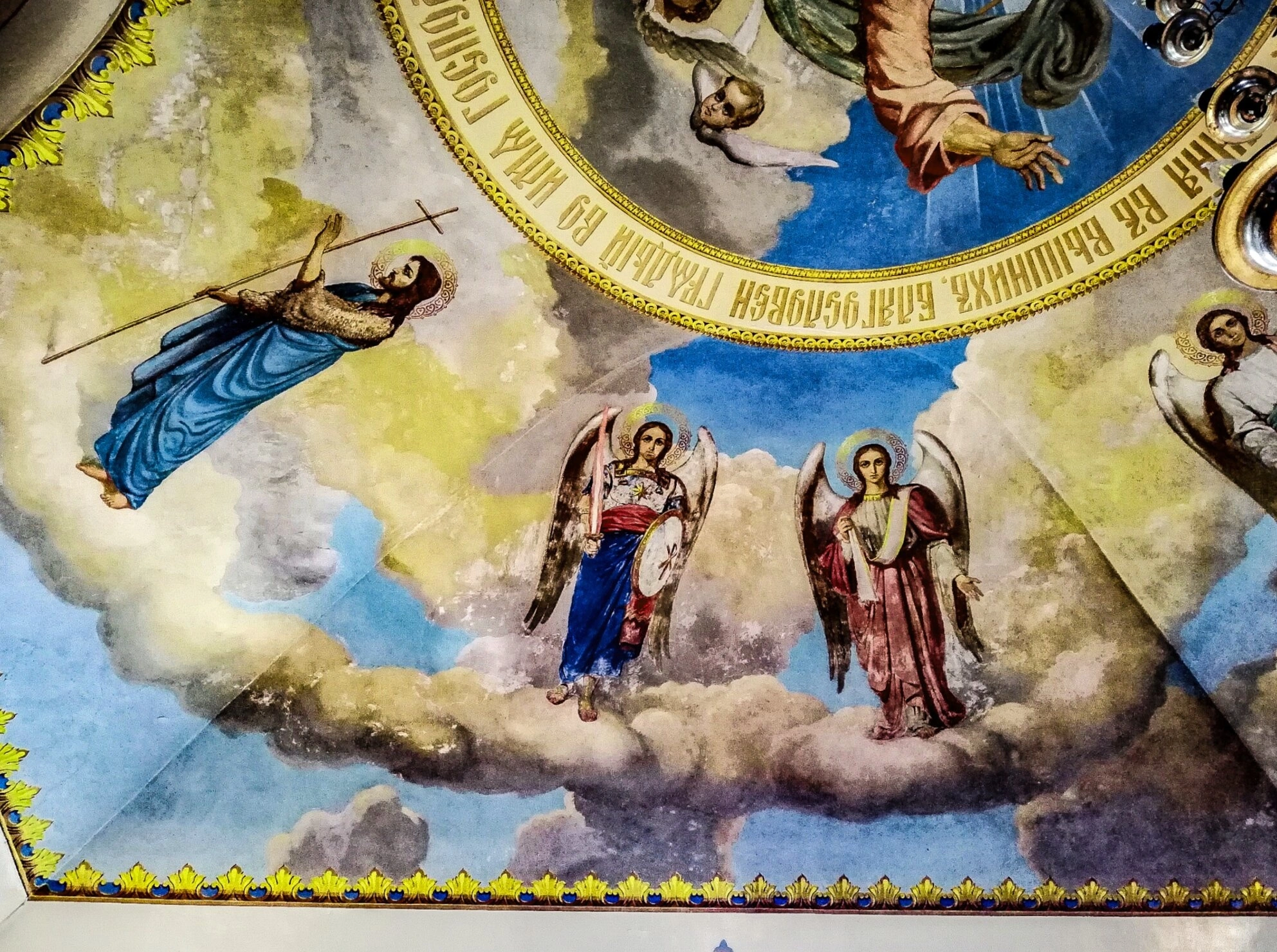 На представленной фотографии запечатлена монументальная роспись, украшающая свод храма в честь святого Архистратига Михаила, что в древнем городе Торжке Тверской области. Живописная композиция, выполненная в традициях православной храмовой живописи, представляет собой величественное изображение Небесных Сил бесплотных и угодников Божиих, пребывающих в славе Господней.