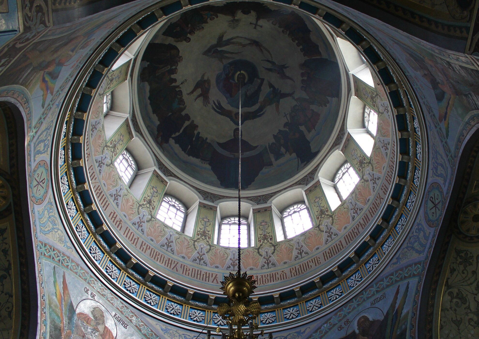 Массивное паникадило (храмовая люстра), свисающее в центре, не только выполняет практическую функцию освещения, но и символизирует небесный светильник, напоминая верующим о свете Истины, который Христос принёс в мир. Декоративные элементы и орнаменты, обрамляющие архитектурные формы, подчёркивают сакральность пространства и направляют молитвенное внимание ввысь, к небесам.