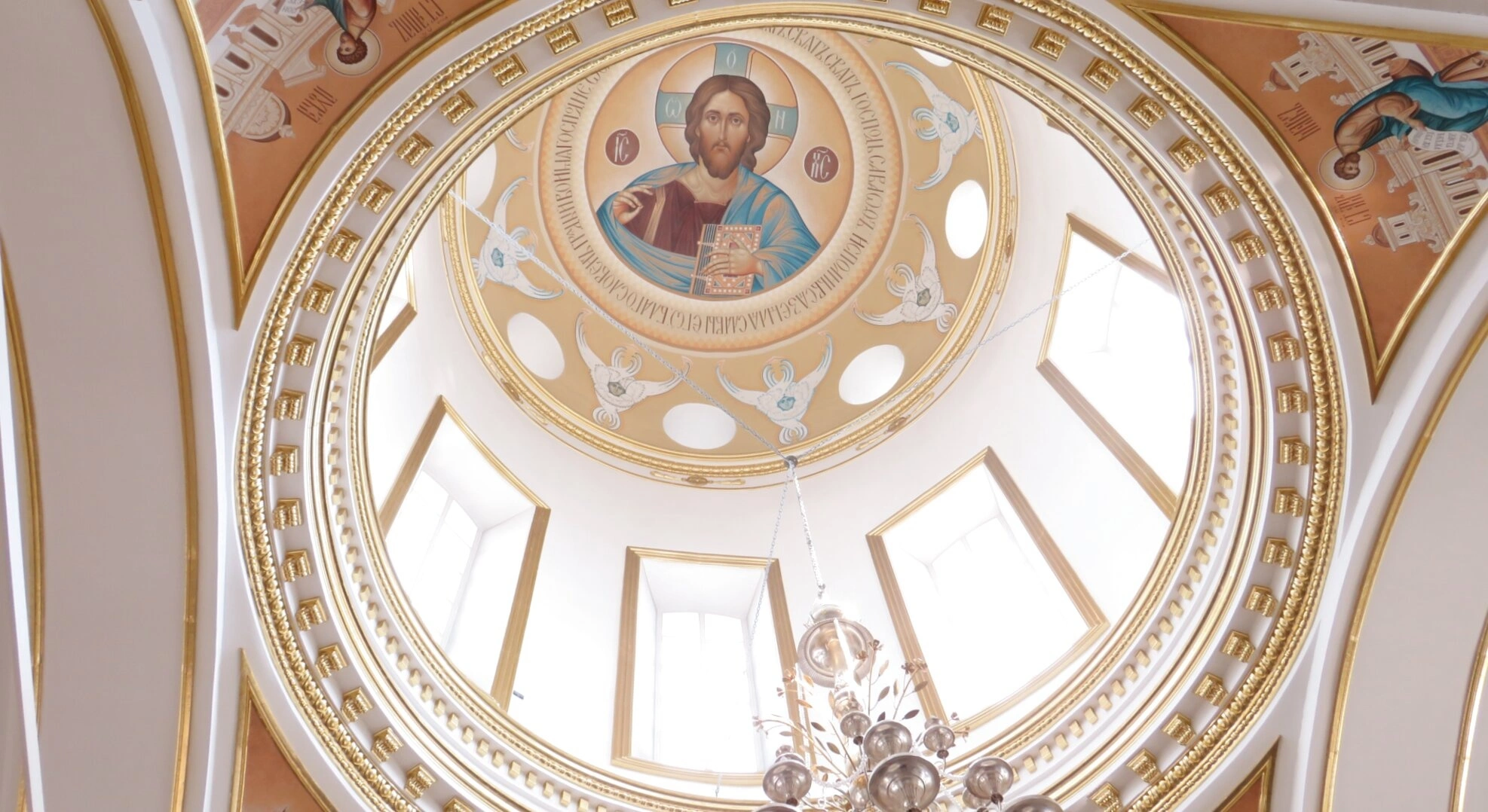 Лик Спасителя, исполненный духовной силы и милосердия, обрамлён золотым сиянием нимба. Вседержитель благословляет предстоящих десницей, а в шуйце держит раскрытое Евангелие, символизирующее Благую Весть для всего человечества. Роспись купола, выполненная в канонической манере, богато украшена золотыми орнаментами и декоративными элементами, которые создают эффект неземного сияния и божественного света.