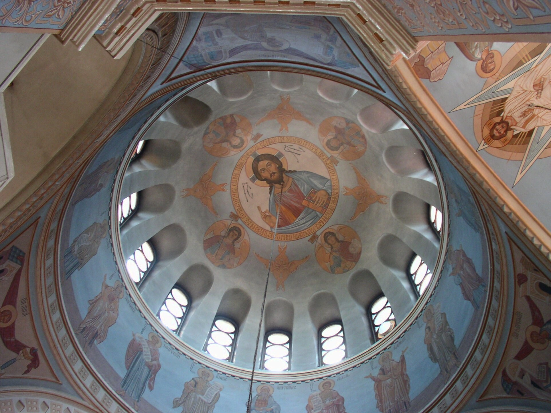Роспись купола нисходит вниз по барабану, где, вероятно, представлены образы ветхозаветных пророков или двенадцати апостолов, предстоящих пред Престолом Господним. Композиция является классической для православной храмовой живописи, где купол символизирует Небесный Царство, а фигура Христа Пантократора олицетворяет власть Господа над всем миром. Своды храма и арки, видные на снимке, также украшены орнаментами и ликами святых, создавая единый богословский и художественный ансамбль, настраивающий молящихся на высокий молитвенный лад.