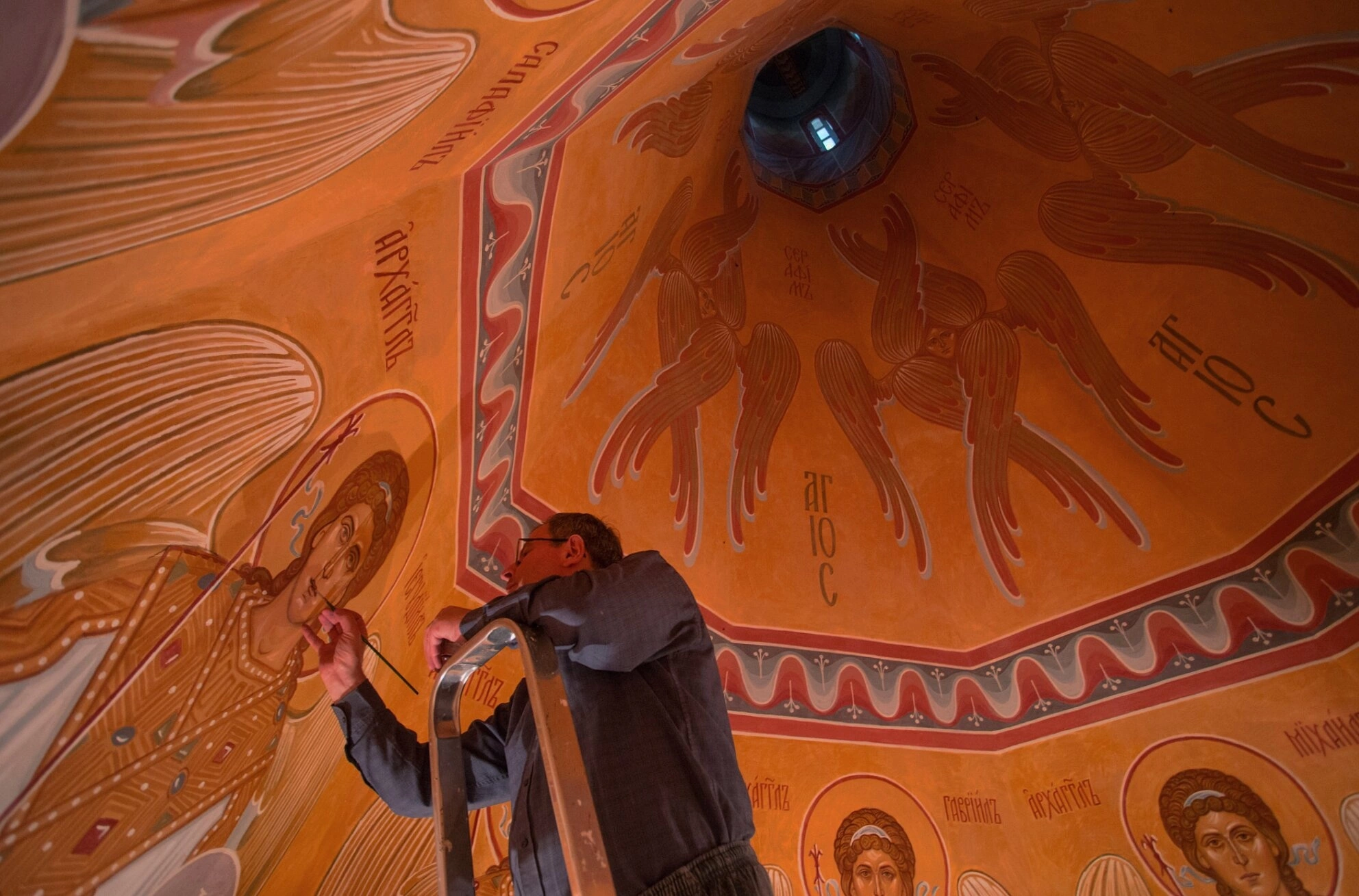 На фотографии запечатлён знаменательный момент создания монументальной храмовой росписи. Художник-монументалист, стоя на специальных подмостях, выполняет работу по украшению внутреннего пространства свода Спасо-Преображенского собора, входящего в ансамбль мужского монастыря Спаса на Угре, что в Калужской области. Его труд посвящён воссозданию и сохранению уникального духовного наследия.