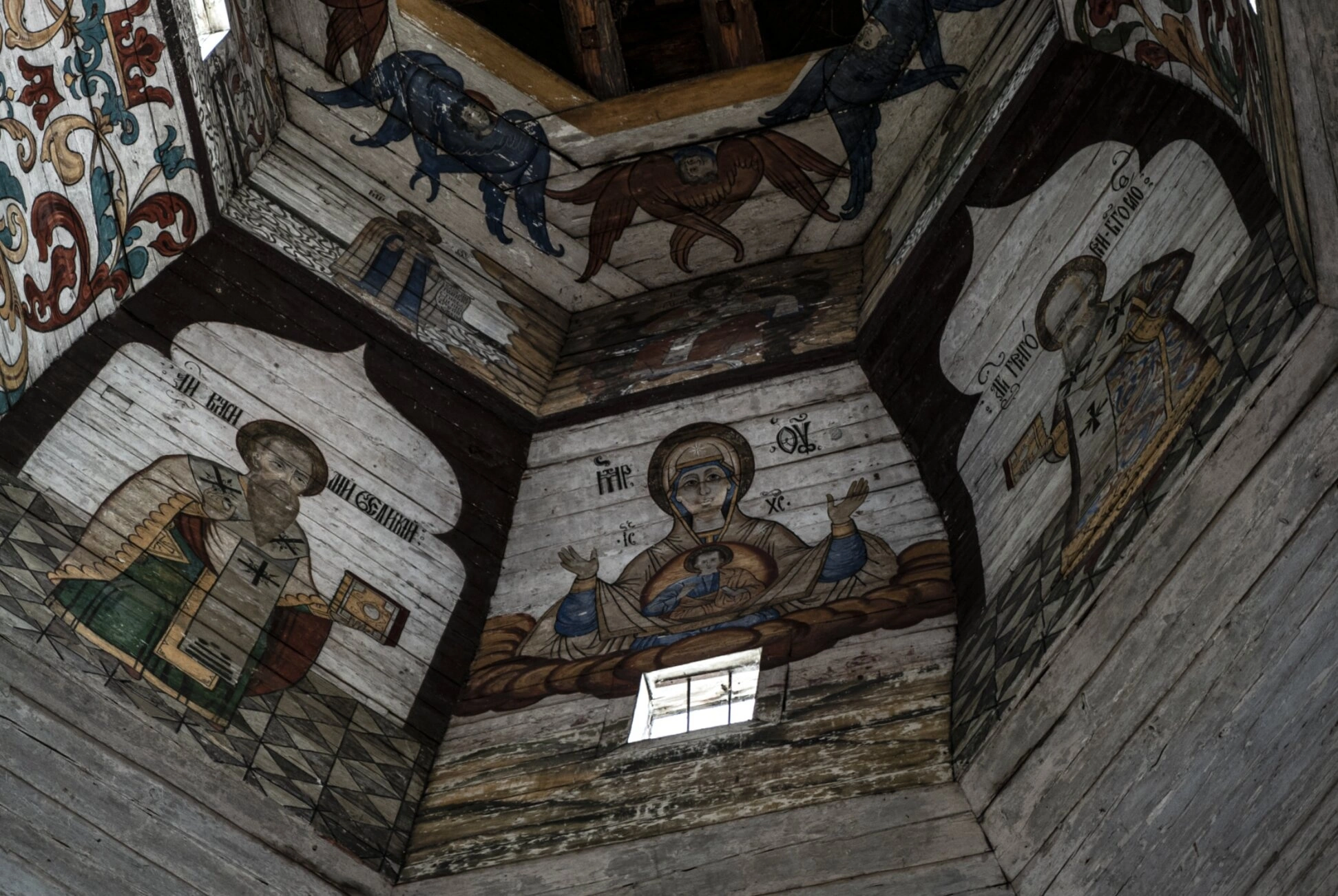 По сторонам от центрального образа, на гранях шатра, расположены фигуры святых, предстоящих в молитве. Среди них, как свидетельствуют исторические описания интерьера этого храма, могут быть изображения святителей – Василия Великого, Григория Богослова и Иоанна Златоуста. В самой верхней части композиции, ближе к вершине купола, размещены символические изображения небесных сил или библейские символы, выполненные в архаичной манере, характерной для северной церковной живописи. Вся роспись выполнена в сдержанной, но глубокой цветовой гамме, где преобладают охристые, зелёные и синие тона, что создаёт атмосферу молитвенной сосредоточенности и благоговения.