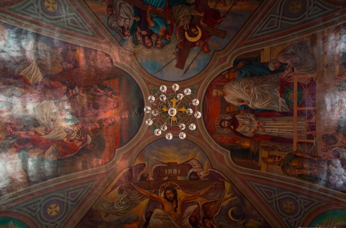Свод разделён на несколько кессонов, каждый из которых содержит полноценную фресковую композицию на евангельские темы. В нижней части кадра различима сцена Распятия Господня с предстоящими, где над главой Спасителя начертаны буквы I.Н.Ц.I., обозначающие «Иисус Назорей, Царь Иудейский». Соседние композиции, исполненные в традициях академической церковной живописи, изображают святых и ангельские силы на фоне облачного неба, что создаёт эффект небесного свода, раскрывающегося над молящимися.
