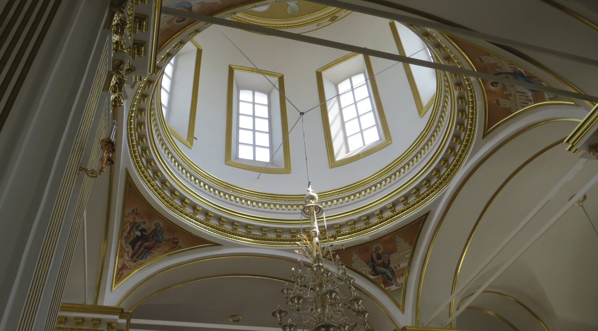 Росписи отличаются насыщенной цветовой палитрой, обилием золочения и сложной художественной проработкой деталей, что создаёт эффект сияния и неземной красоты. В нижней части кадра видна массивная золочёная паникадила (храмовая люстра), которая завершает вертикальную композицию интерьера и символизирует собою небесный светильник.