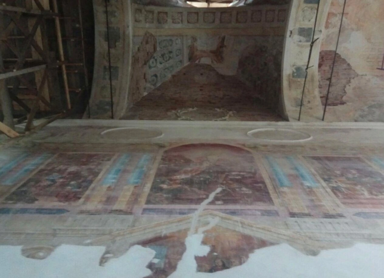 Сводчатая конструкция потолка демонстрирует характерные для церковного зодчества арочные элементы, часть которых находится в процессе укрепления. В левой части изображения установлены деревянные строительные леса, свидетельствующие о ведущихся реставрационных работах. Стены храма показывают признаки разрушения: отслоение штукатурки, обнажённая кирпичная кладка и утраты красочного слоя.