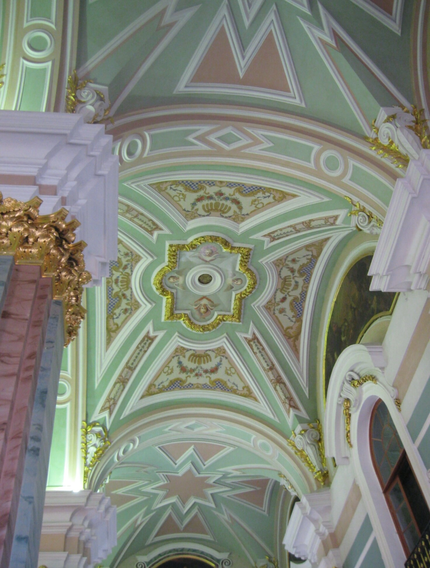 Росписной плафон, обрамлённый сложным лепным декором, выполнен в мягкой пастельной гамме, где преобладают благостные зелёные и бежевые тона, символизирующие небесную сферу и духовное просветление. Обильное золочение элементов лепнины, выполненное сусальным золотом, многократно усиливает свет, льющийся из окон, и наполняет пространство храма божественным сиянием, что соответствует канонам оформления православных церквей.