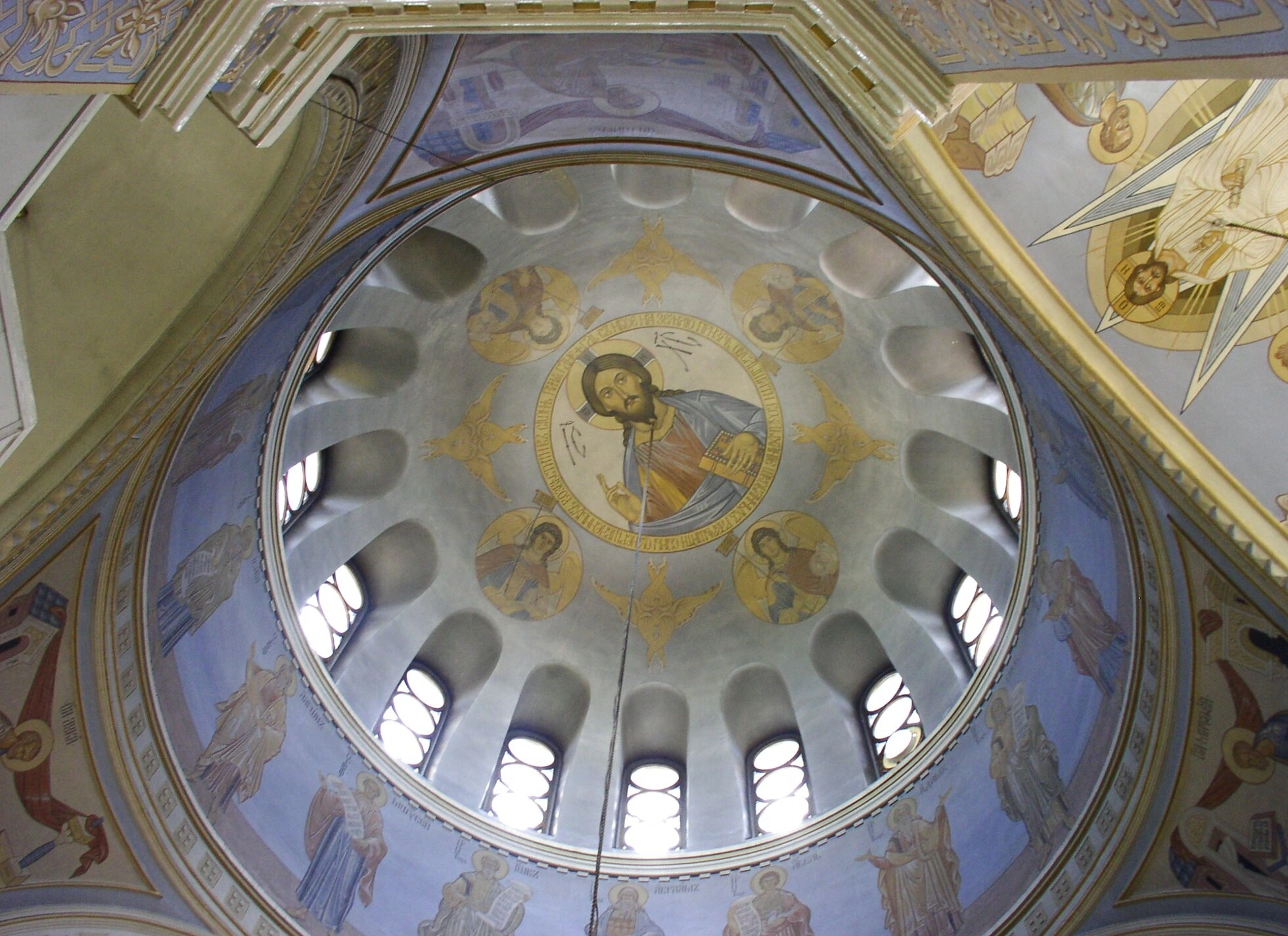Ниже, по окружности купола, могут располагаться изображения праотцев, пророков Ветхого Завета или святых апостолов, что характерно для классической византийской иконографии. Росписи выполнены в канонической манере, с использованием глубоких лазурных, золотистых и пурпурных тонов, что создаёт ощущение небесной славы и благодати. Свет, проникающий через оконные проёмы барабана, мягко освещает фрески, подчёркивая их духовную глубину и художественное совершенство.