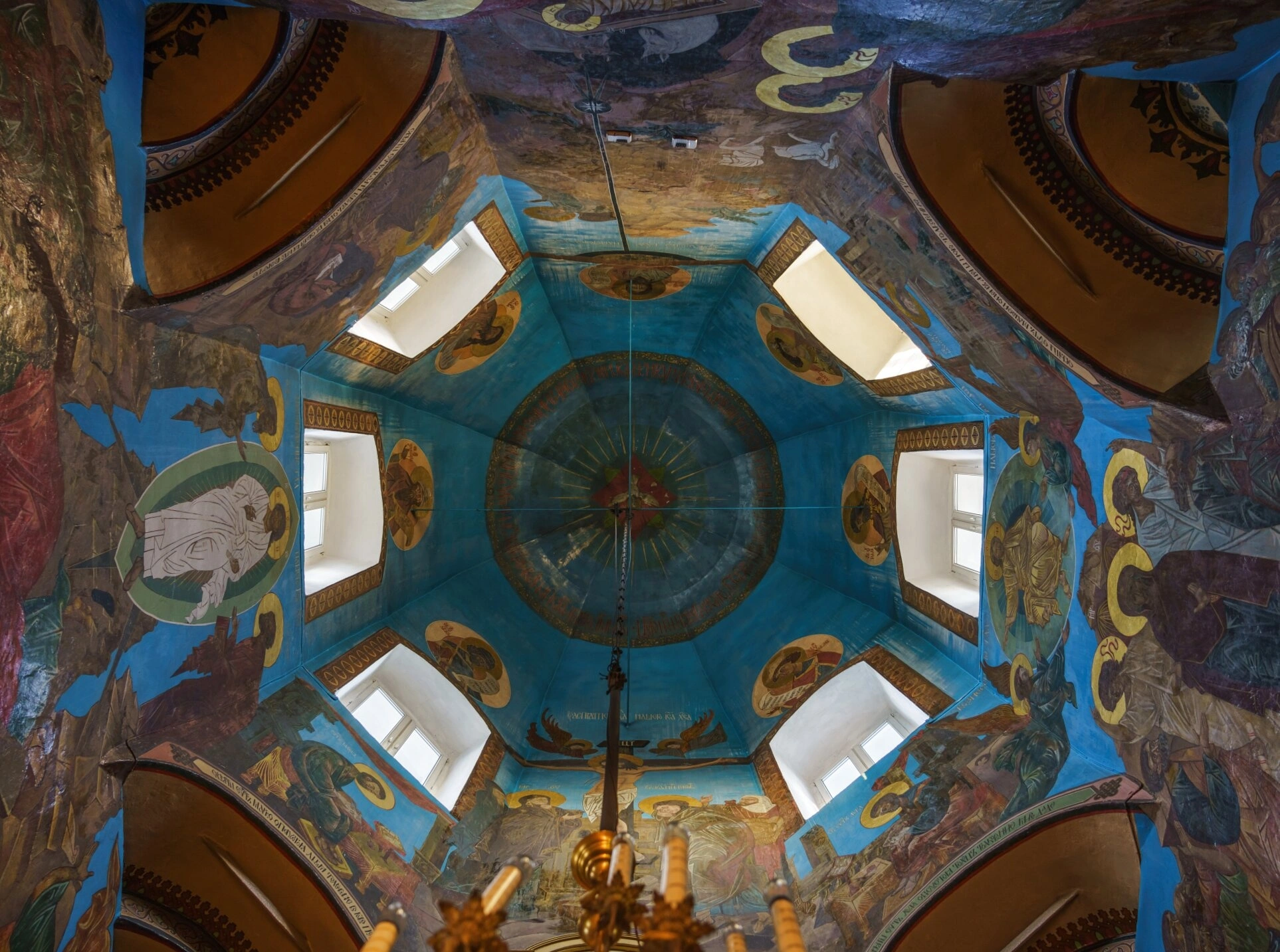 Центральную часть композиции занимает роспись купола, выполненная в сине-голубых тонах, символизирующих небесную сферу. От купола расходятся украшенные фресками своды, на которых представлены библейские сюжеты и образы святых. В декоре преобладают теплые охристые, коричневые, синие и золотистые оттенки, создающие торжественную и благоговейную атмосферу.