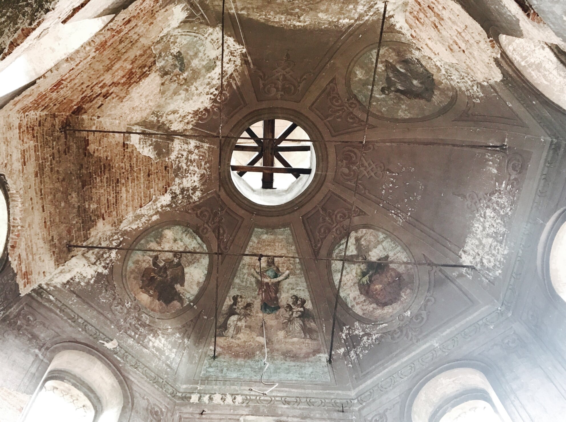 Несмотря на сильные разрушения, на гранях купола и его сводах чудом сохранились фрагменты монументальной храмовой живописи. Под отверстием, в центральной медальоне, угадывается композиция, изображающая Пресвятую Богородицу с Младенцем Христом, либо иной евангельский сюжет, окружённый ликами святых и праведников. Росписи, исполненные в канонической православной манере, ныне сильно пострадали от времени и небрежения: штукатурка осыпалась, обнажив кирпичную кладку, красочный слой утрачен.