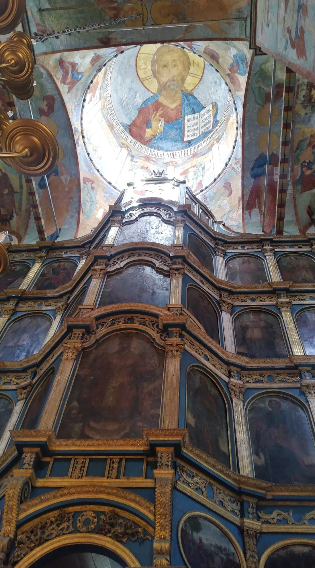Росписи охватывают все своды и арки собора, создавая целостное художественное пространство. Цветовая палитра фресок отличается богатством оттенков: глубокие лазурные тона сочетаются с золотистой охрой, благородными красными и тёплыми земляными цветами. В правой части снимка видна часть резного позолоченного иконостаса, верхняя часть которого оформлена в виде арок, обрамляющих священные изображения.
