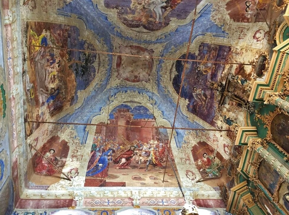 Справа на фотографии различима часть резного золочёного иконостаса, который органично сочетается с настенной росписью, образуя целостный художественный ансамбль. Храм в селе Новое, построенный в 1826 году, является выдающимся памятником архитектуры позднего классицизма и объектом культурного наследия. Эти фрески представляют собой не только религиозную, но и огромную историко-культурную ценность, сохраняя для потомков духовные и художественные традиции православной Руси.