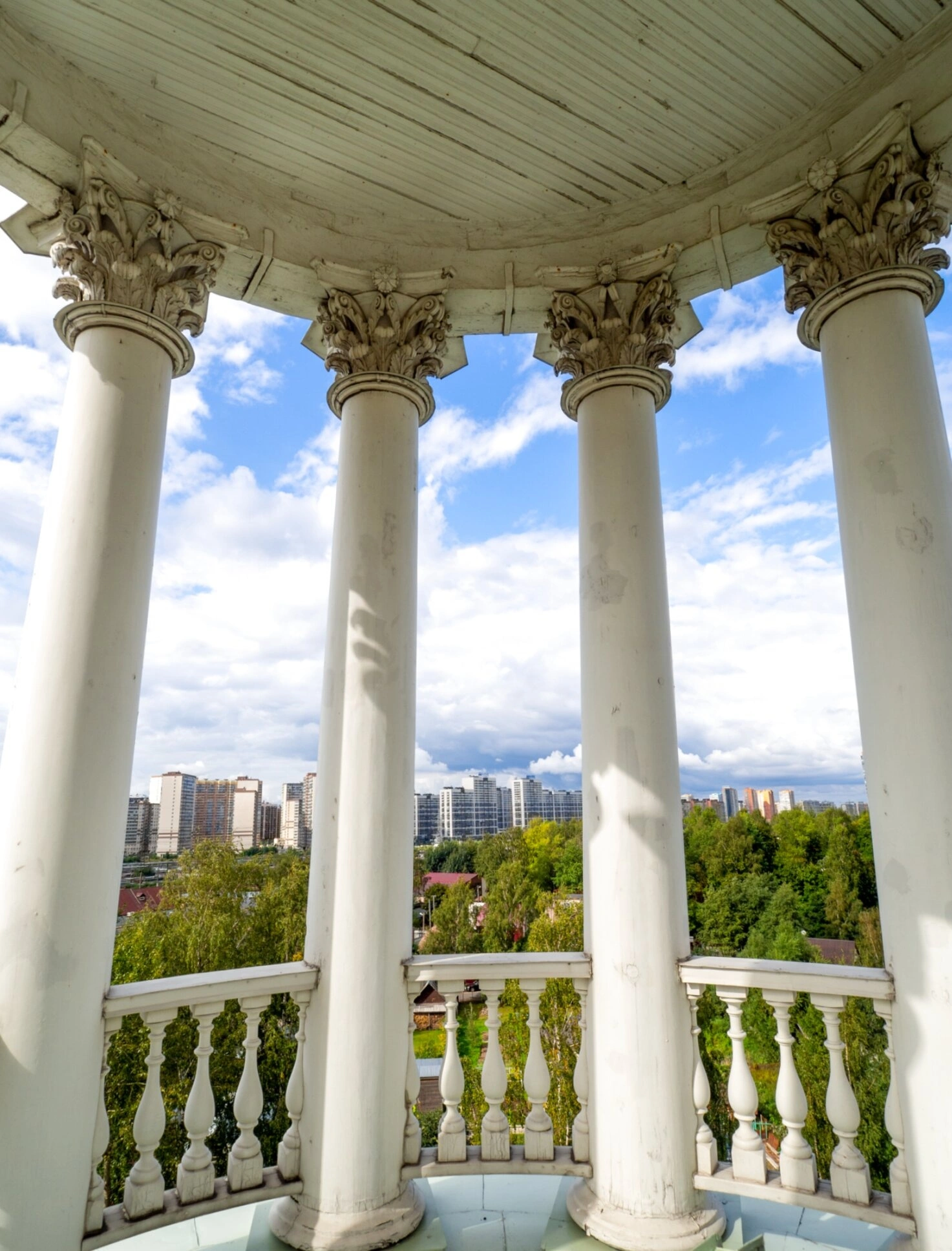 На представленной фотографии запечатлена величественная ротонда, являющаяся частью архитектурного ансамбля Церкви Святой Великомученицы Екатерины Александрийской, что в городе Мурино Ленинградской области. Четыре мощные колонны коринфского ордера, увенчанные изящными капителями, поддерживают легкий купольный свод, создавая гармоничную и завершённую композицию. Между колоннами установлен ажурный балюстрадный парапет, характерный для классической русской храмовой архитектуры.