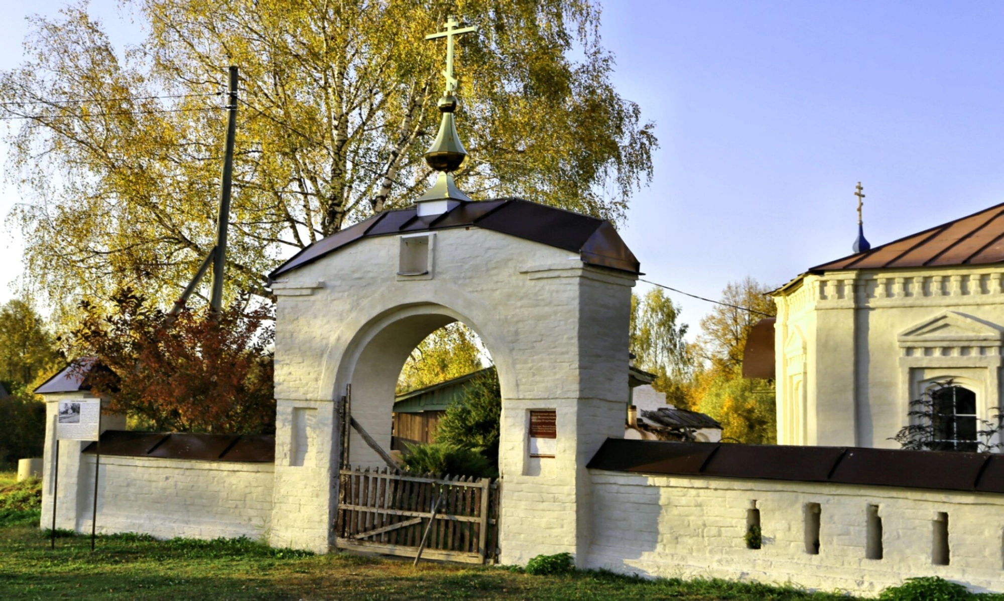 Справа от ворот открывается вид на часть основного храмового здания, выполненного из белого кирпича и покрытого коричневой кровлей. Над церковной крышей также возносится святой крест, осеняющий собой всю округу. Осенние деревья с золотистой листвой создают прекрасное обрамление для архитектурного ансамбля, подчеркивая духовную значимость этого места.