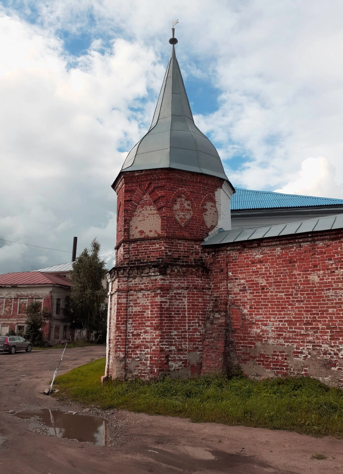 Крепостная башня, выполненная из добротного красного кирпича, являет собою образец традиционного русского оборонного зодчества XVII века. Венчает её стройный шатёр, покрытый тёсом, с небольшим оконцем-слухом для освещения лестницы и полицей для стока дождевой воды. На кирпичной кладке видны следы многовековой истории и благочестивые труды по восстановлению святой обители.