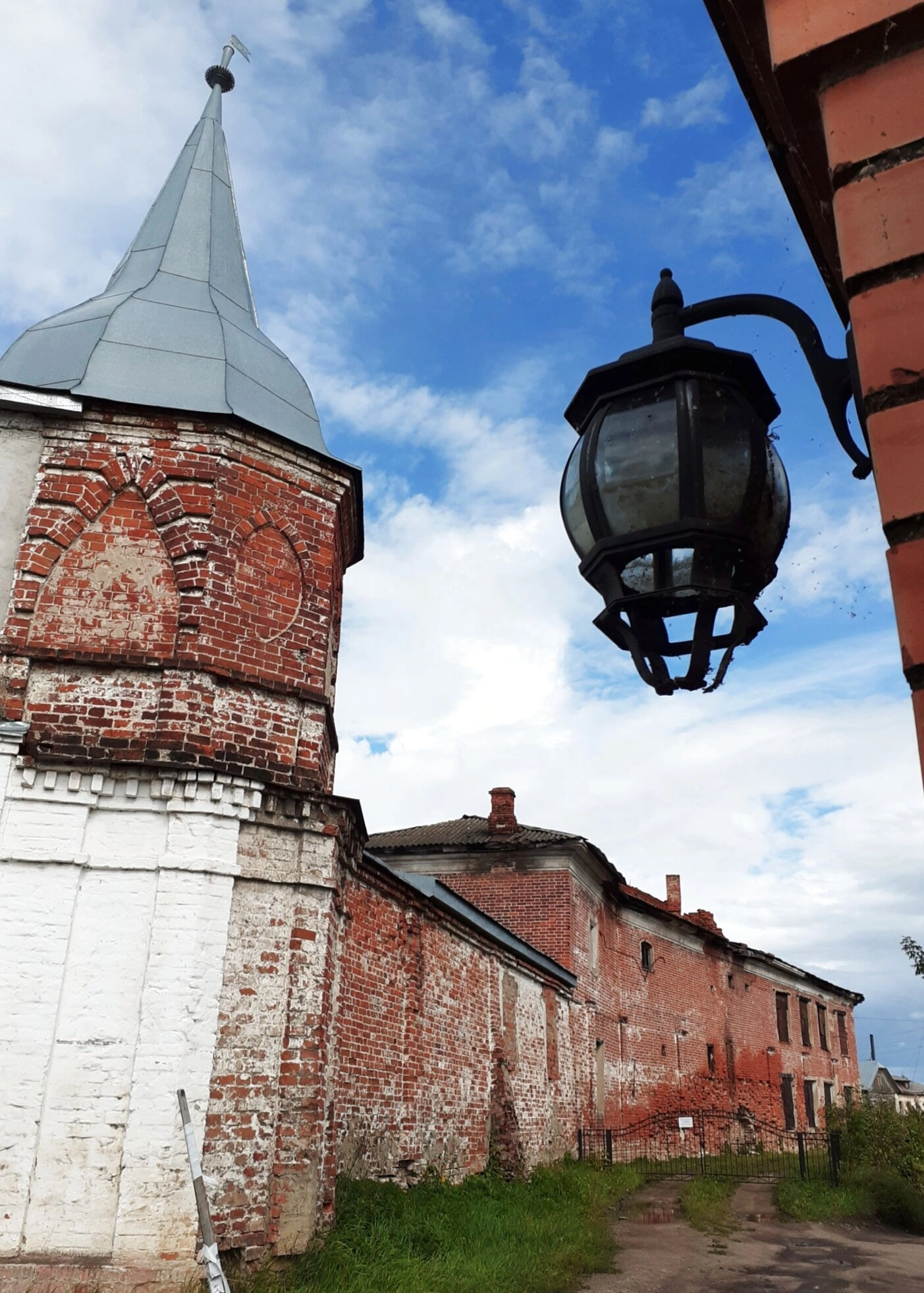 Каменный двухэтажный корпус, который мы видим на снимке, представляет собой образец монастырской жилой и хозяйственной архитектуры более позднего периода. Строгие линии фасада, украшенные скромным декором, говорят о простоте и функциональности монашеского быта. Венчает здание высокая гранёная башенка, увенчанная православным крестом, которая служит важной архитектурной доминантой и напоминает о молитвенном назначении этого места.