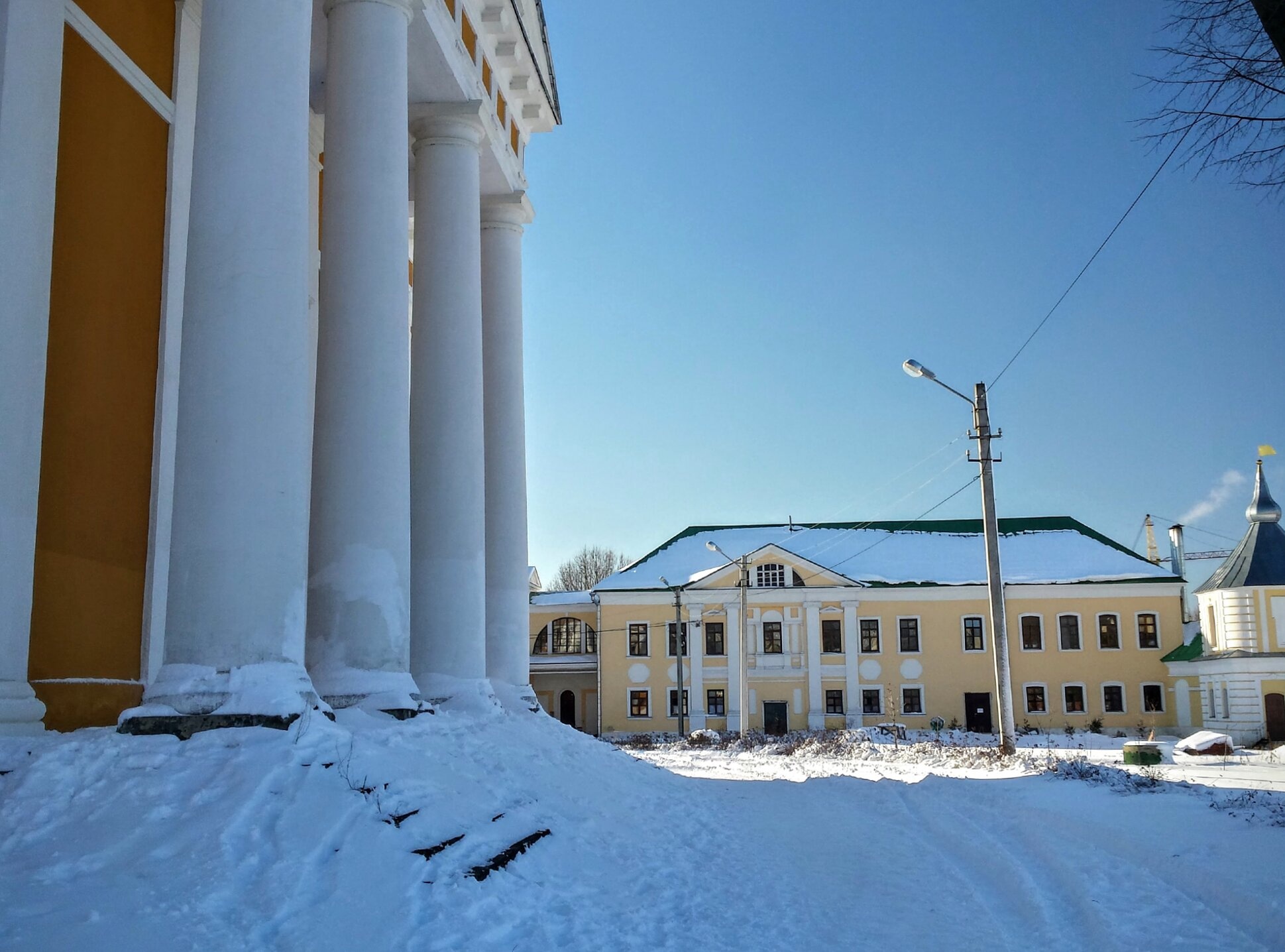 На заднем плане изображено двухэтажное здание желтого цвета с многочисленными окнами и зеленой крышей, также покрытое снегом. Этот строения монастырского комплекса гармонично дополняют архитектурный ансамбль. Справа в кадре виден элемент, напоминающий купол или башню с остроконечным завершением, что характерно для традиционных форм православной храмовой архитектуры.