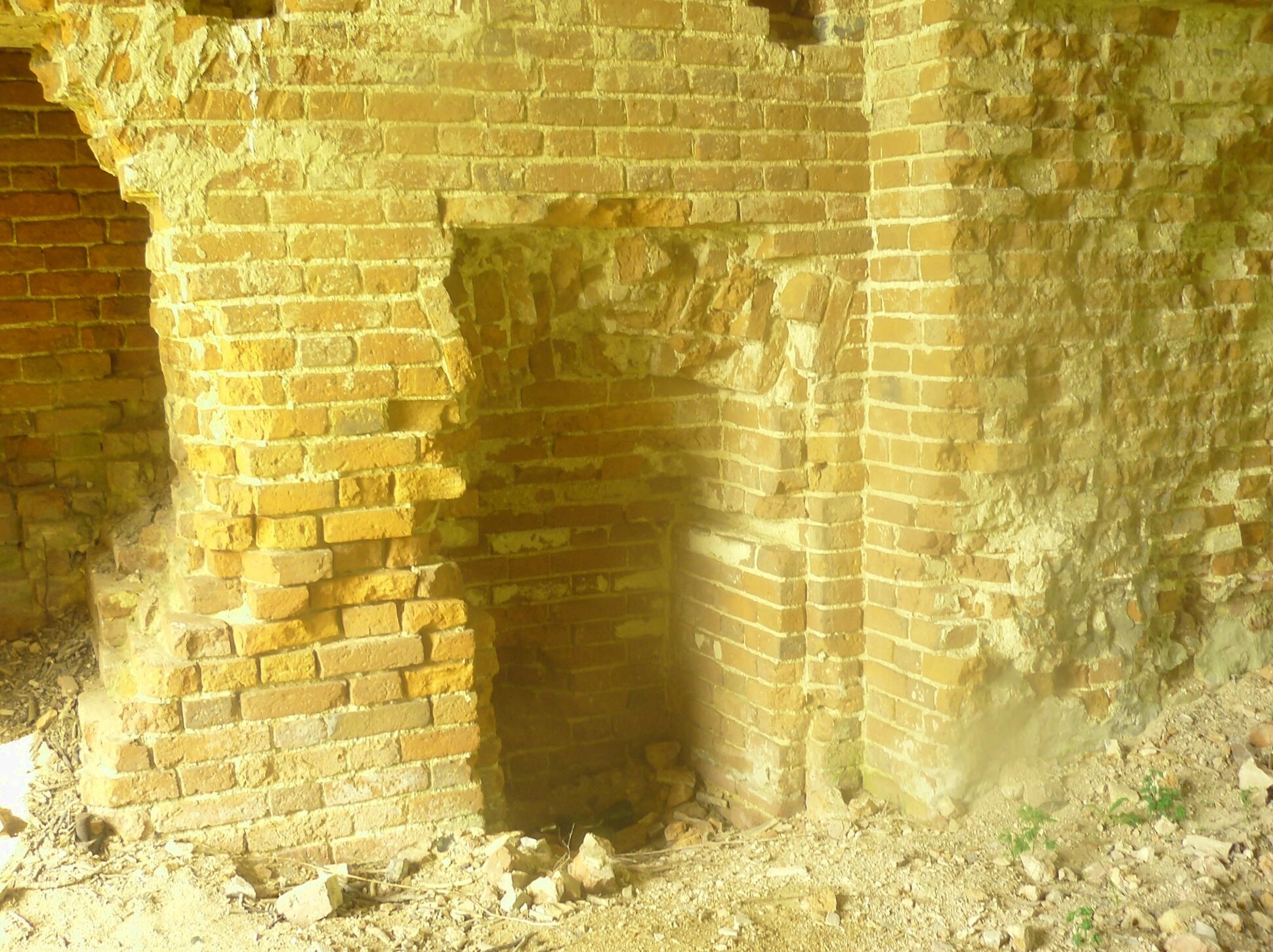 Кирпичная кладка, выполненная из красного кирпича, подверглась значительному выветриванию и механическим повреждениям. Швы между кирпичами утратили значительную часть связующего раствора, что привело к осыпанию и нарушению структурной целостности стены. В композиции стены просматриваются два арочных проёма: левый проём частично скрыт, а центральный представляет собой нишу, нижняя часть которой полностью обрушена.
