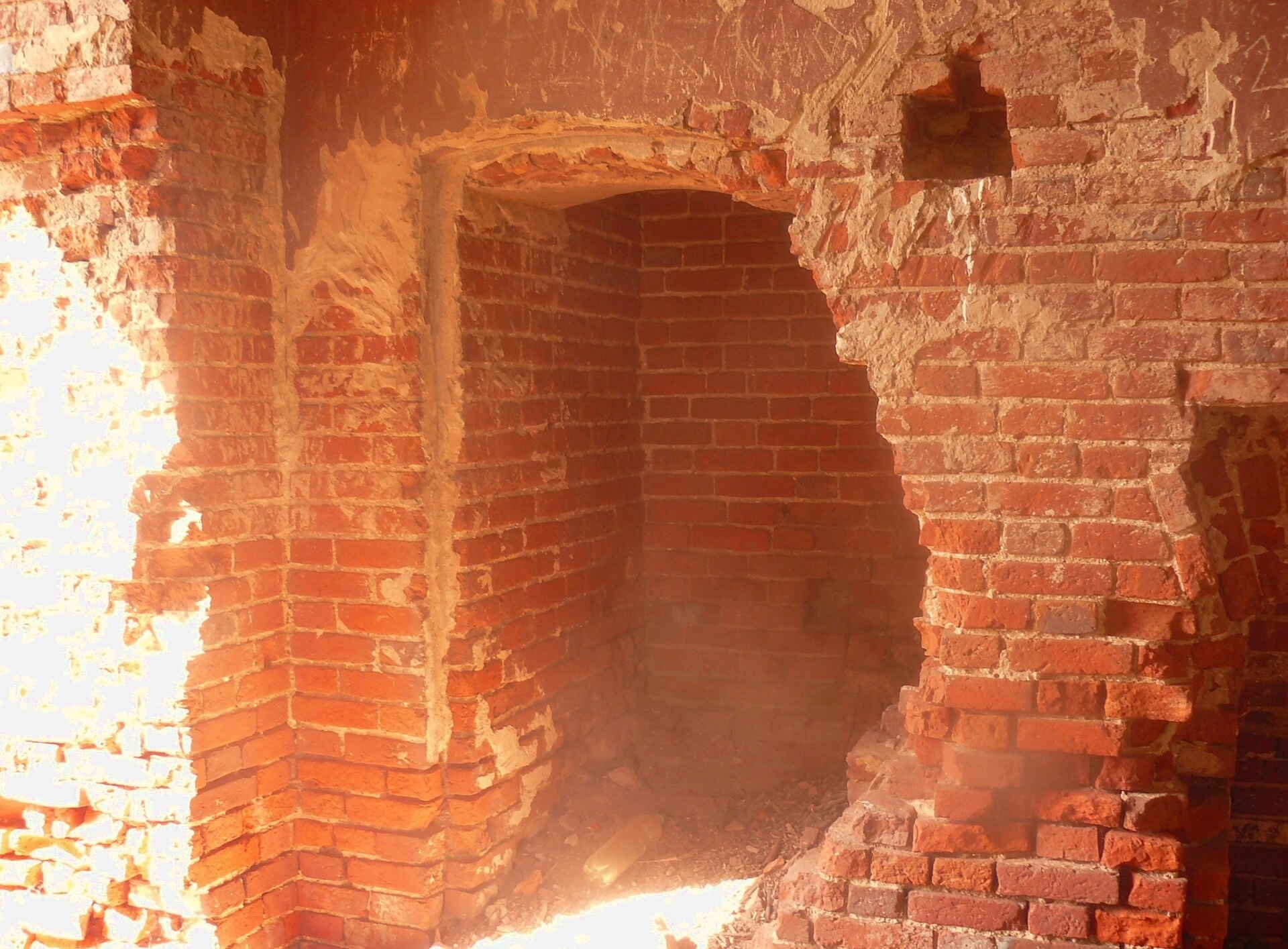 На снимке отчетливо видна внутренняя часть храмового пространства, вероятно, алтарной апсиды. Стены, сложенные из красного кирпича на цементном растворе, несут на себе следы многолетнего забвения. Кладка местами обнажена, штукатурный слой почти полностью осыпался, оставив лишь фрагментарные напоминания о былой благолепной отделке. В центральной части композиции возвышается арочный проем, ведущий в глубину помещения, а над ним угадываются очертания малого проема или заложенной ниши.
