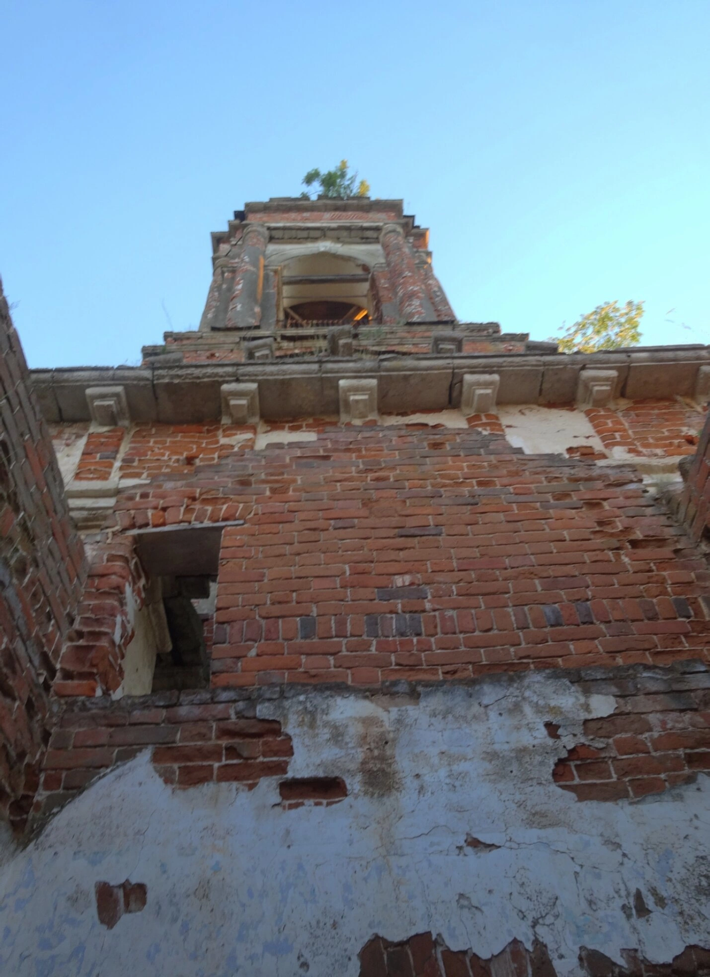 Видны остатки кирпичных стен и основания колокольни, которые, несмотря на разруху, продолжают устремляться в небо. Густая растительность, оплетающая кладку, символизирует забвение, но также и непрерывную жизнь этого намоленного места. При внимательном рассмотрении угадываются элементы архитектурного декора, характерного для храмового зодчества конца XIX — начала XX веков.