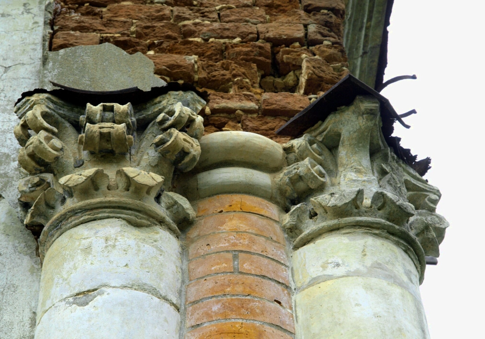 На представленной фотографии запечатлены скорбные, но величественные останки некогда прекрасного храма — Церкви Казанской иконы Божией Матери, располагавшейся в селе Брыньково. Снимок детально показывает фрагменты разрушенной кирпичной кладки и уцелевшие основания колонн с резными капителями, которые даже в своём нынешнем состоянии свидетельствуют о былом архитектурном благолепии и мастерстве зодчих.