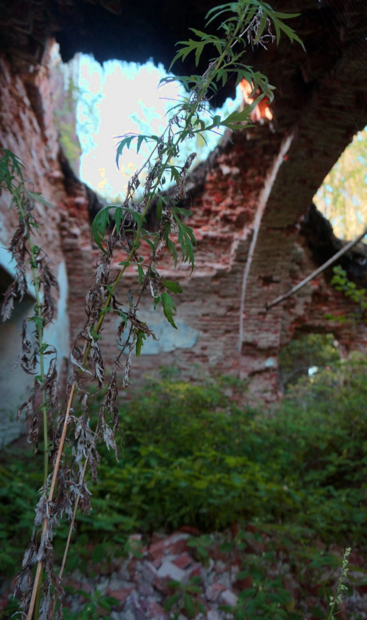 Внутреннее пространство храма и прилегающая территория густо заросли травой и кустарниками, что символизирует неумолимый ход времени и тленность всего земного. На переднем плане видно пожухлое растение, что лишь подчёркивает контраст между вечной жизнью природы и хрупкостью творений рук человеческих. Церковь была возведена в XIX веке и являлась частью архитектурного ансамбля города, однако в XX столетии, постигшая многие святыни участь, не миновала и этот храм.