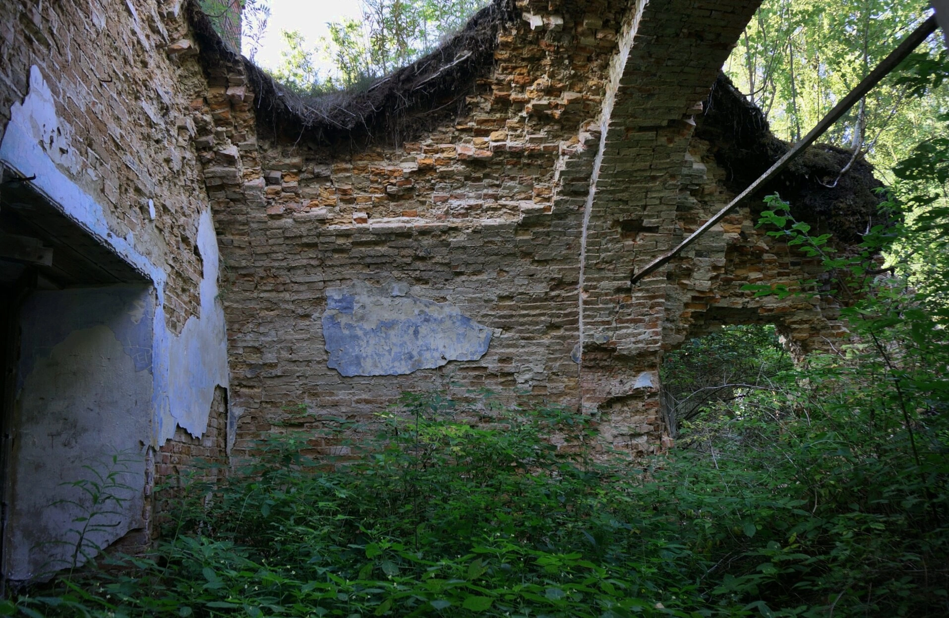 Величественный кирпичный храм, ныне пребывающий в запустении, был возведён во имя славных и всехвальных апостолов Петра и Павла. Его стены, некогда освящённые молитвой и благодатью, ныне безмолвствуют, уступая натиску времени и растительности. На фотографии видны фрагменты несущих стен и уцелевшие архитектурные элементы, позволяющие различить следы былой архитектурной гармонии и строгости форм, характерных для православного зодчества.