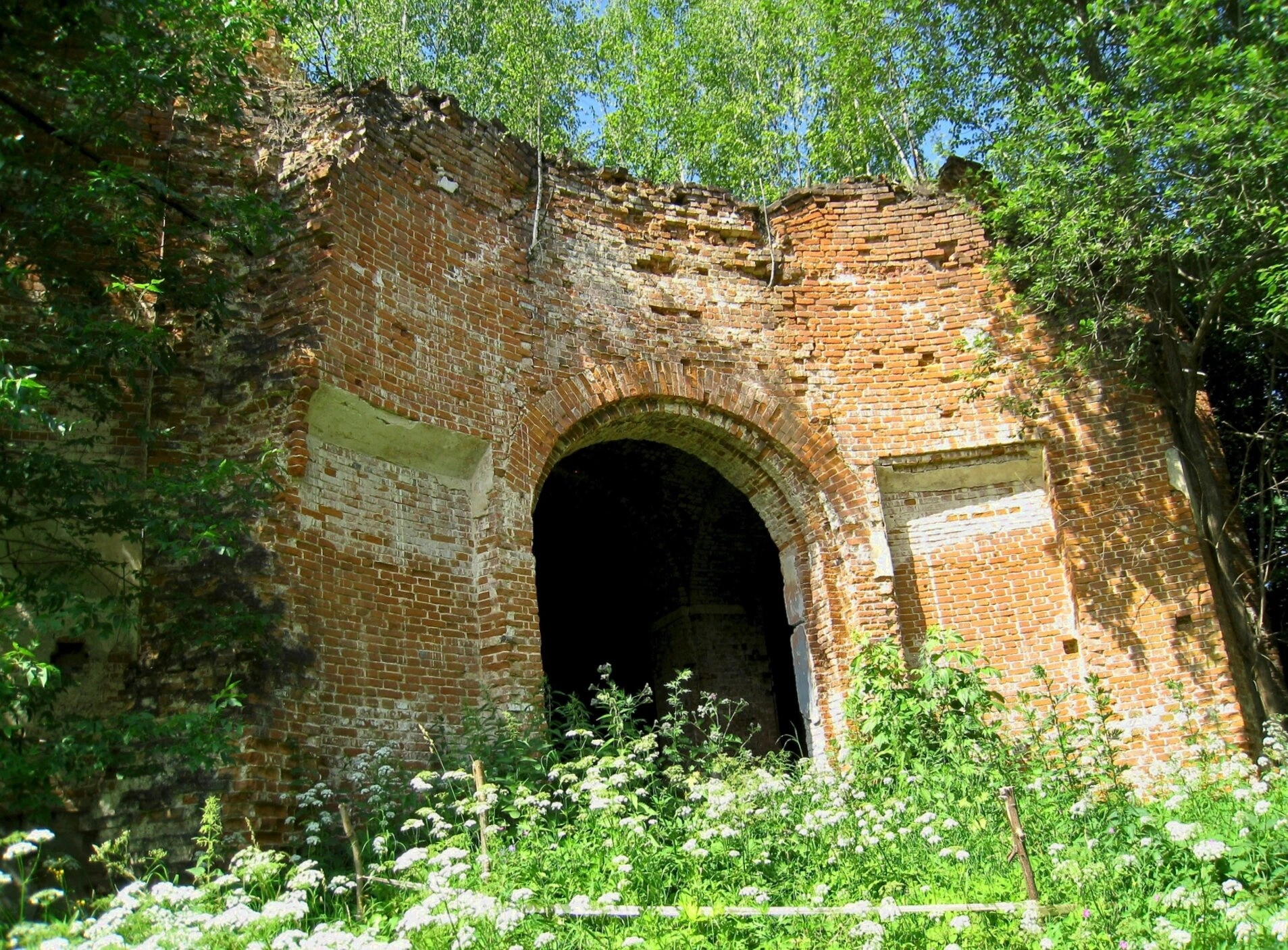 На представленной фотографии запечатлены скорбные руины Церкви Преображения Господня, что располагалась в селе Селинском Клинского района. Снимок демонстрирует восточную часть некогда благолепного храма, в частности, область алтарной апсиды. Сохранившийся фрагмент стены сложен из красного кирпича, ныне сильно выветренного и поврежденного. Центральным элементом композиции является высокая полукруглая арка, вероятно, бывший дверной проем или оконный проем алтаря. Кладка над аркой и по бокам от нее частично обрушена, что свидетельствует о длительном запустении святого места.