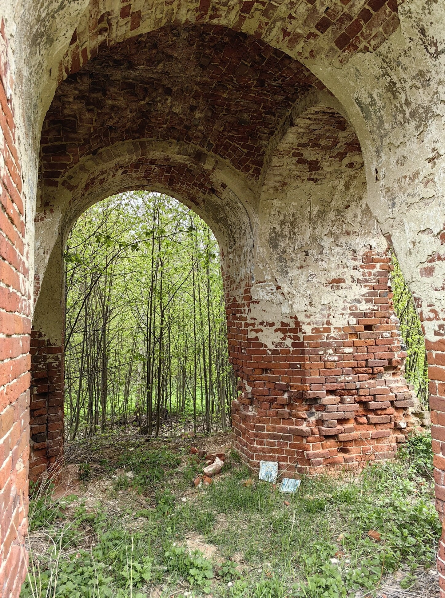 На переднем плане возвышаются массивные кирпичные арки, сохранившие despite разрушения свою монументальность и строгие архитектурные формы. Кирпичная кладка, выполненная с традиционным для православного зодчества мастерством, местами обнажена, утратив штукатурное покрытие. Сквозь арочные проёмы открывается вид на молодой лес, символически напоминающий о временном забвении святыни и одновременно о непрерывности Божьего творения.