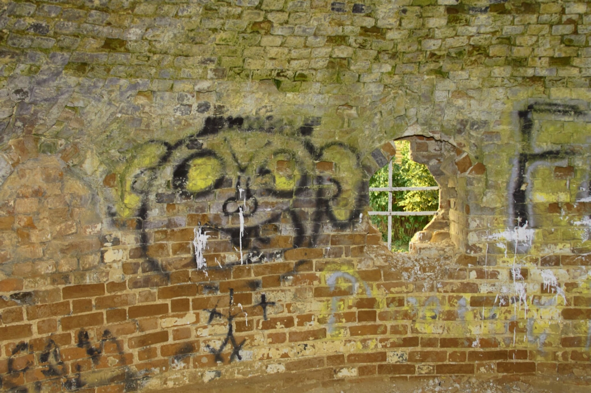 Кирпичные стены храма, сложенные из красного кирпича, несут на себе следы многолетнего забвения. Священные стены, которые прежде слышали молитвы и церковные песнопения, теперь испещрены кощунственными граффити и неуместными рисунками, нанесенными краской. Через арочный пролом в кладке, который когда-то мог быть частью церковного окна или свода, открывается вид на окружающую природу и металлическую решетку.