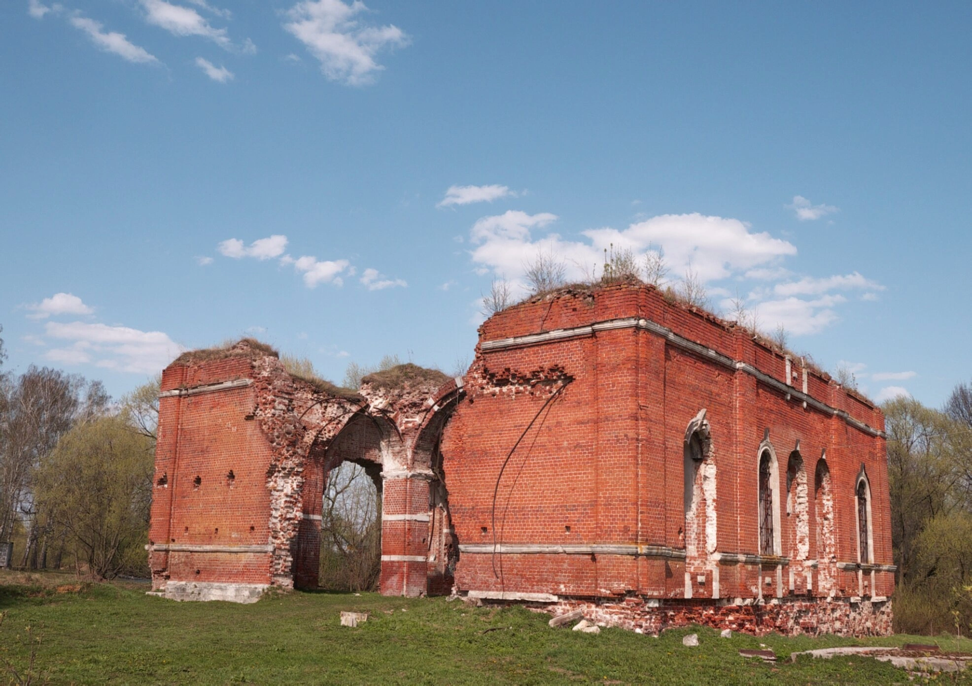 На фотографии запечатлены величественные руины Церкви Рождества Христова, расположенной в селе Березнецово Московской области. Храм выполнен из красного кирпича и демонстрирует характерные элементы православной церковной архитектуры, включая арочные проёмы и остатки сводчатых конструкций. Частично разрушенные стены позволяют рассмотреть особенности кладки и внутреннее пространство сооружения.