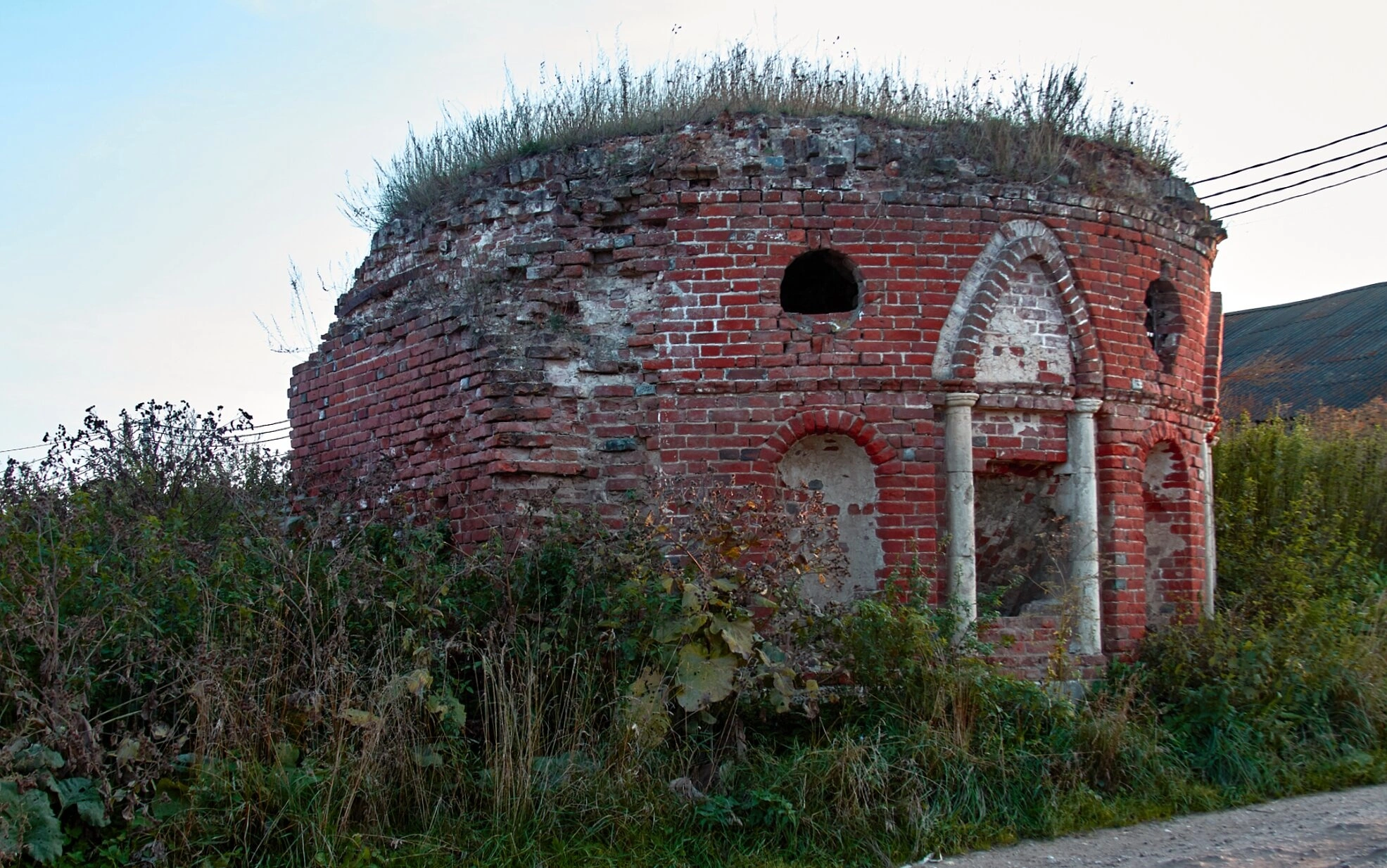 На снимке изображена сохранившаяся часть апсиды - алтарный выступ, обращённый к востоку, согласно православной традиции. Кирпичная кладка из красного кирпича, некогда аккуратная и прочная, ныне демонстрирует следы разрушительного действия времени. Верхняя часть строения полностью утрачена и поросла травой, что придаёт руинам особую умиротворённость.
