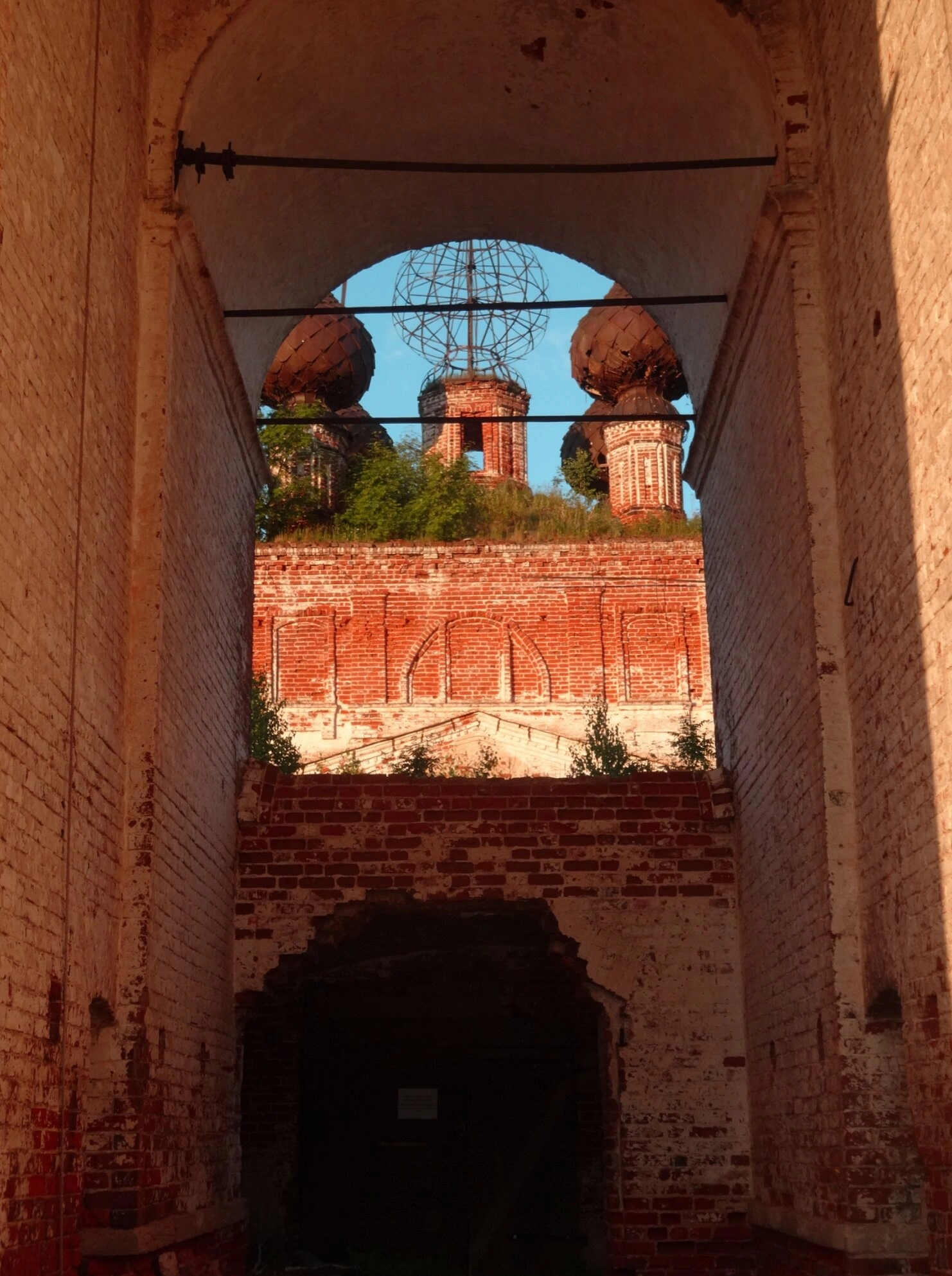 Через крупный круглый проём в стене, напоминающий бывшее окно-розу, и другие повреждения конструкции виднеются внешние элементы храма — остатки колокольни и куполов с ажурными металлическими каркасами, которые когда-то поддерживали главы. На фоне разрушенных стен контрастирует синее небо и зелёная растительность, символизируя непрерывность бытия несмотря на человеческое забвение.