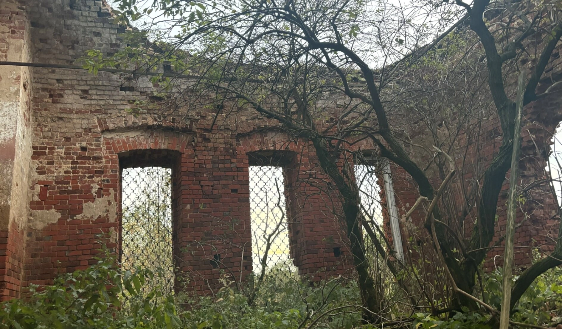 Сохранившиеся фрагменты стен из красного кирпича с тремя арочными оконными проемами являют собой печальное зрелище. Благородные арки, лишенные оконных рам, зияют пустотой, напоминая о былой красоте храмовой архитектуры. Кирпичная кладка местами серьезно повреждена, штукатурка почти полностью осыпалась, обнажая древнюю структуру стен.