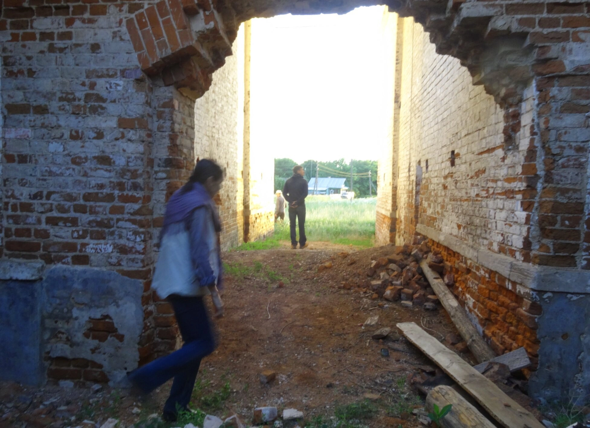 На представленной фотографии запечатлён фрагмент руин некогда величественного храма — Церкви Рождества Пресвятой Богородицы, расположенной в окрестностях села Алексино Лухского района Ивановской области. Снимок демонстрирует массивный кирпичный арочный проём, являющийся уцелевшим элементом стены святыни. Сквозь арку открывается вид на окружающий пейзаж — поля и древесные рощи, что подчёркивает уединённость и заброшенность этого места, некогда бывшего духовным центром для местных жителей.
