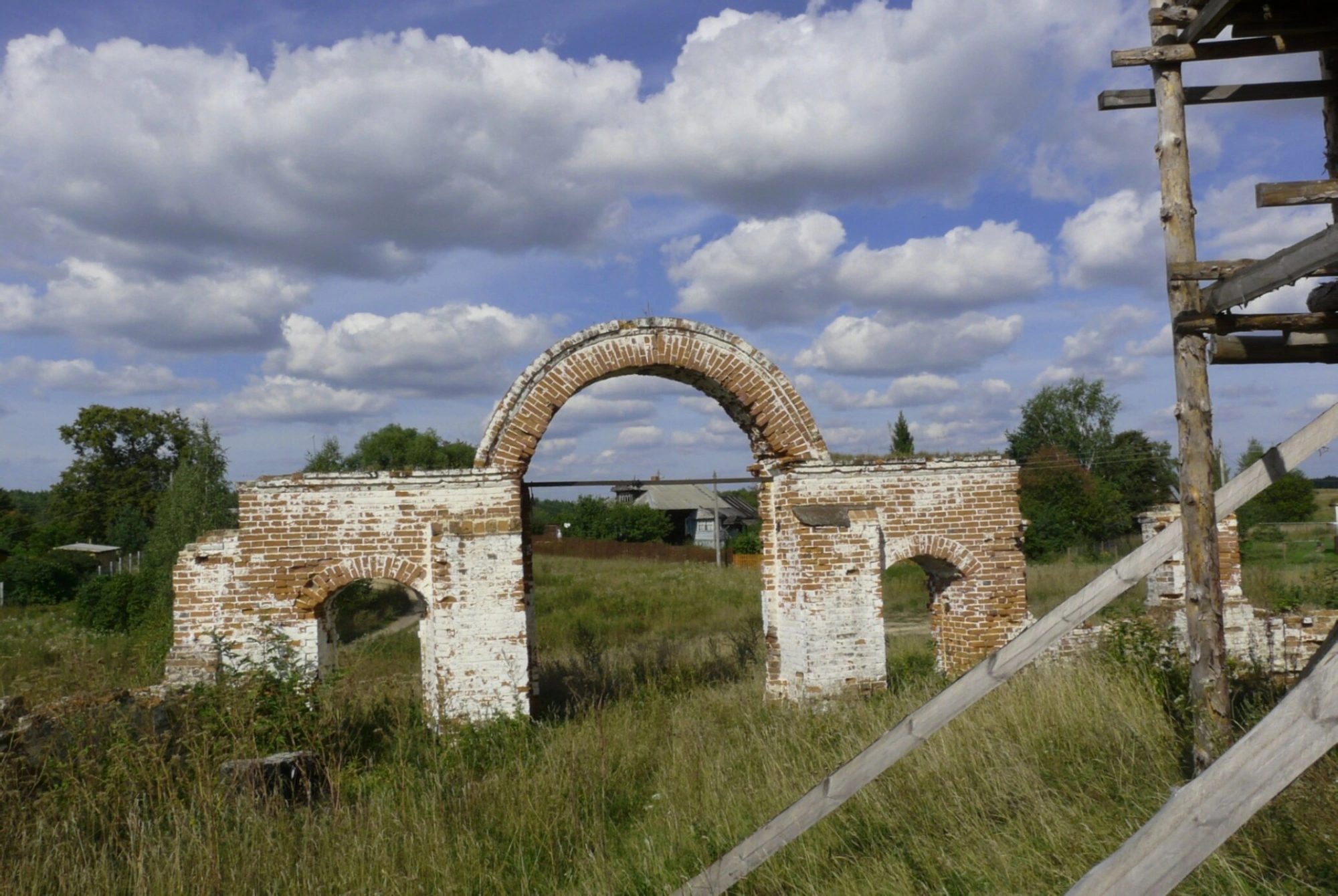 Ярусная колокольня и основной объём храма, сложенные из красного кирпича, дошли до нас в виде фрагментарно сохранившихся стен с арочными оконными и дверными проёмами. Чёткий геометрический рисунок кладки и изящество арок, угадывающиеся даже в нынешнем состоянии, позволяют отнести время постройки к периоду эклектики или позднего классицизма, ко второй половине XIX столетия. На снимке видны элементы, которые могут быть частью строительных лесов или временных укреплений, что свидетельствует либо о попытках консервации, либо о продолжающемся неумолимом разрушении памятника церковной архитектуры.
