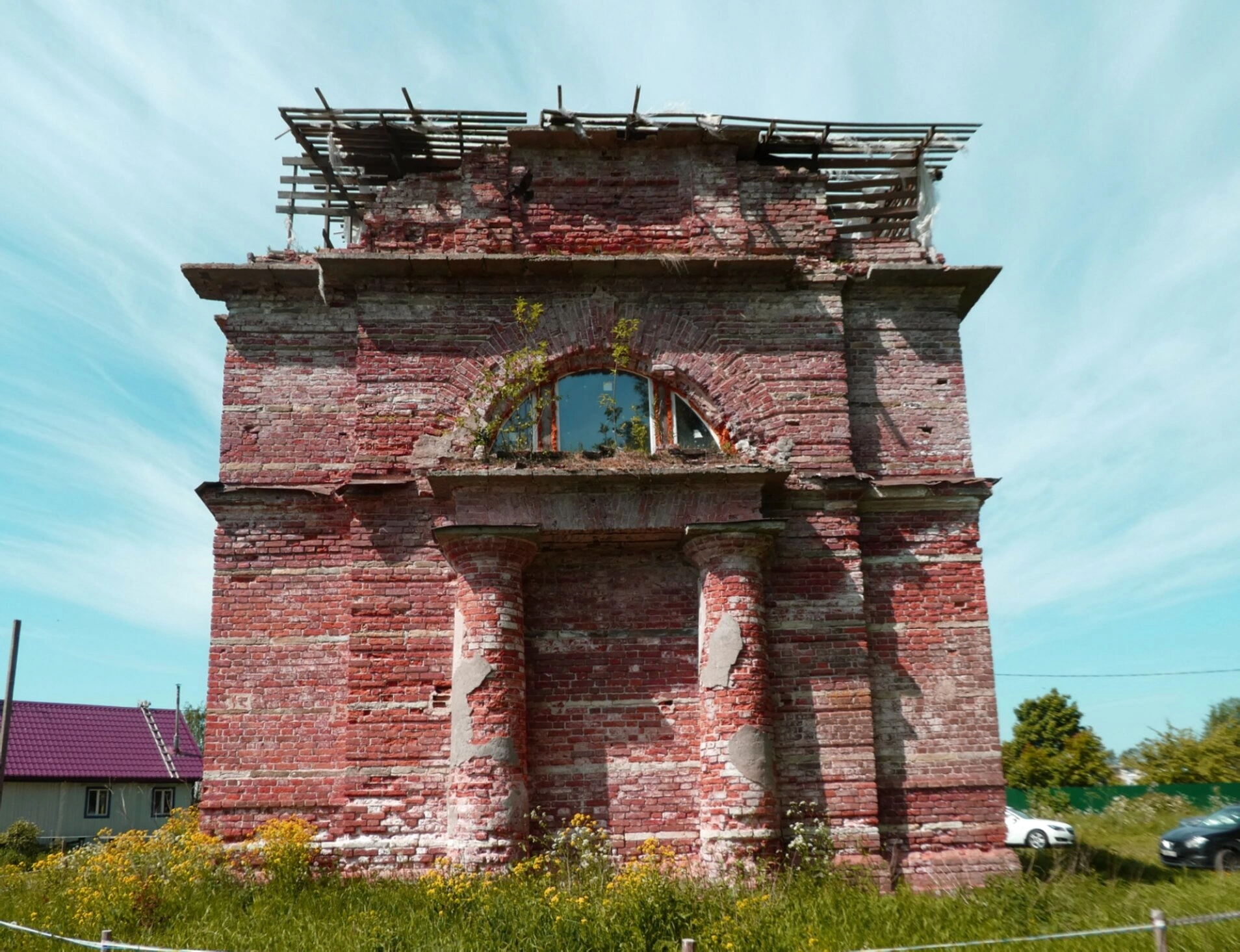 На представленной фотографии запечатлены величественные руины церкви во имя святой великомученицы Ирины, расположенной в исторической местности, известной как Пятая Гора, близ деревни Волгово Ленинградской области. Это скорбное, но исполненное былого величия здание является немым свидетелем ушедшей эпохи и утраченной духовной жизни этих мест.
