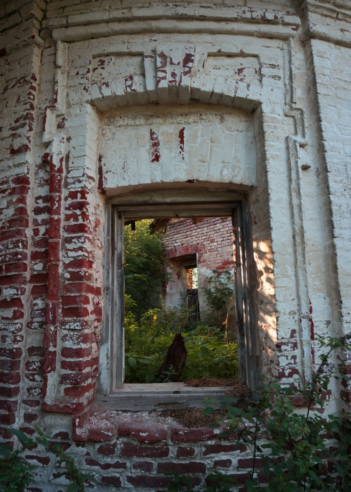 На представленной фотографии запечатлены скорбные руины некогда величественного православного храма — Церкви Святых Первоверховных Апостолов Петра и Павла, что располагается в городе Новая Ладога на улице Кренницы. Снимок фокусируется на арочном оконном проёме, который, словно рана, зияет в теле обветшавшей стены. Сквозь него открывается вид на внутреннее пространство, поглощённое природой и временем.