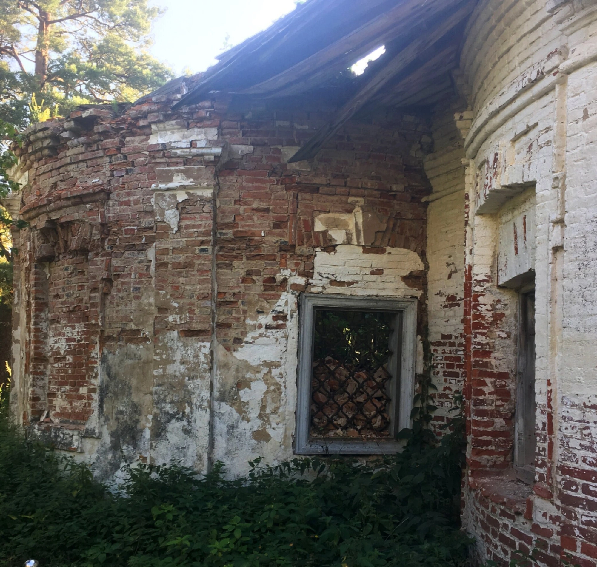 Судя по сохранившимся фрагментам, сооружение было возведено из кирпича и оштукатурено. Несмотря на сильные разрушения, на фасаде угадываются черты традиционной церковной архитектуры. Чётко просматриваются очертания оконных проёмов, один из которых сохранил кованую решётку, напоминающую о прошлой целостности и предназначении этого места. Крыша и части стен практически полностью обрушены, открывая взору небо там, где когда-то своды храма были увенчаны куполами.