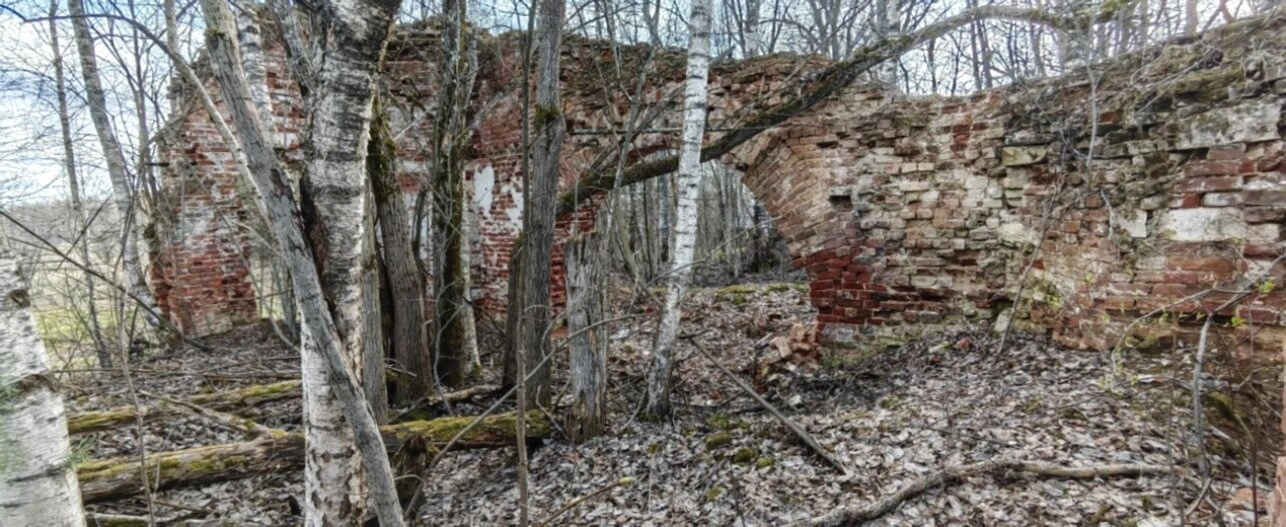 От былого величия дом Божия сохранились лишь фрагменты несущих стен с остатками арочных проемов, свидетельствующих о наличии прежде оконных и дверных пролетов. Кирпичная кладка, местами осыпавшаяся, демонстрирует глубокую ветхость сооружения, постепенно возвращающегося земле. Особую атмосферу благоговейной печали создает окружающий пейзаж – храмовые руины плотно обступили белоствольные березы и другие лиственные деревья, некоторые из которых произрастают непосредственно среди развалин.