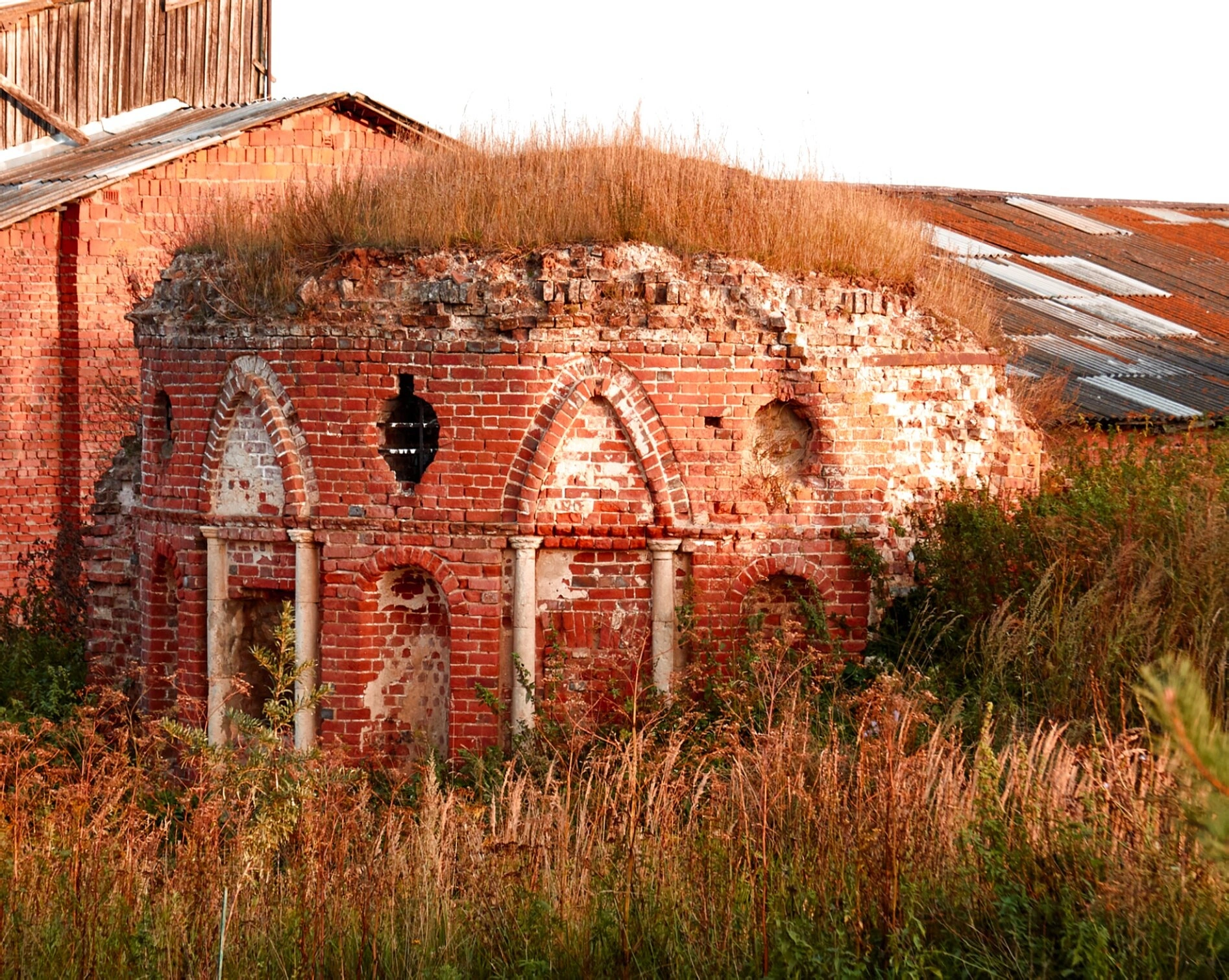 На снимке отчетливо просматривается частично сохранившаяся апсида храма — алтарный выступ, обращенный к востоку согласно православной традиции. Кирпичная кладка, выполненная из красного кирпича, потемнела от времени и непогоды, но еще угадываются благородные формы арочных оконных проемов и декоративные элементы в виде полуколонн, обрамлявших ниши. Эти архитектурные детали свидетельствуют о былом стремлении зодчих к созданию не только функционального, но и прекрасного дома молитвы.