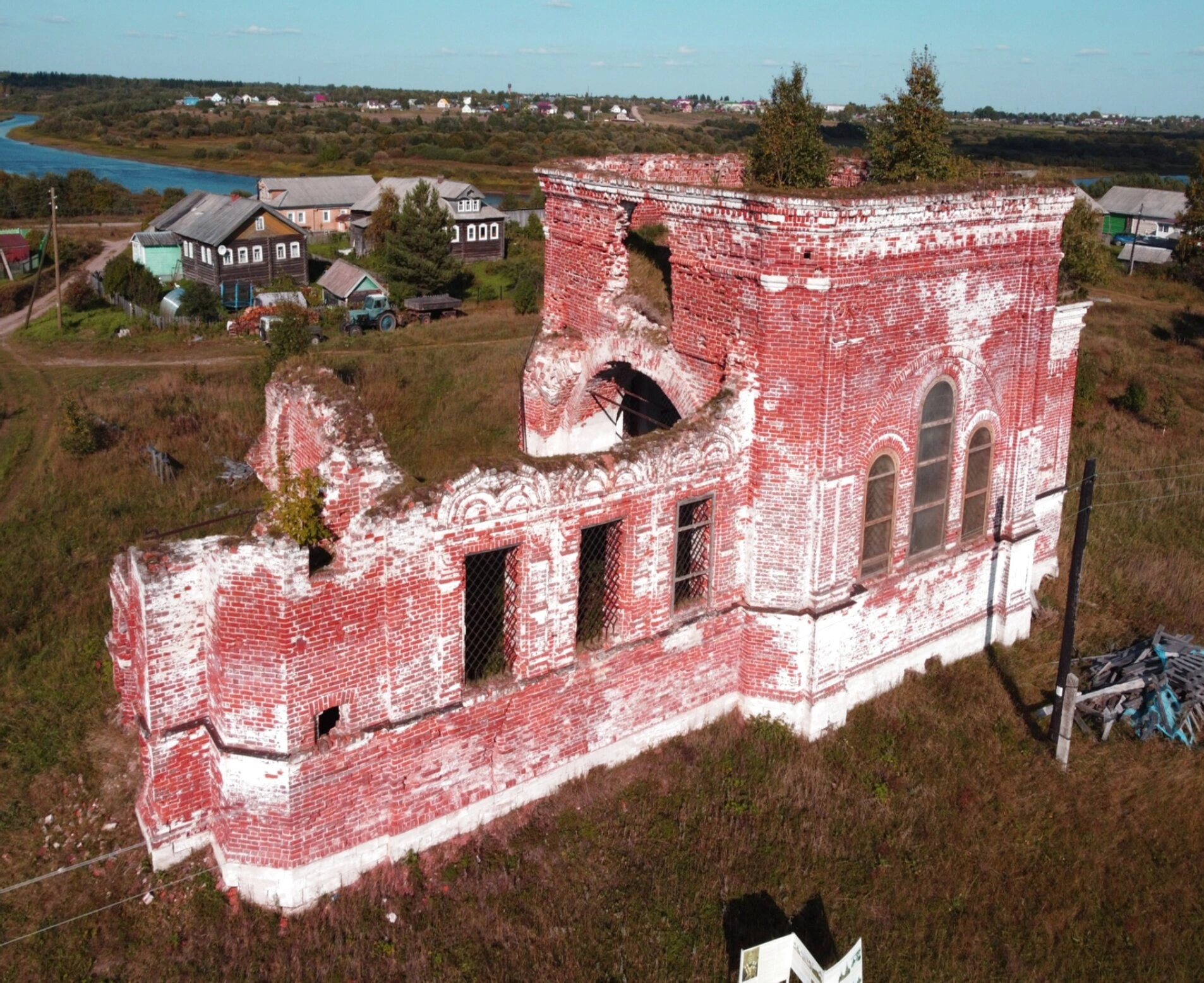 Окружающий пейзаж с рекой и противоположным берегом, где виднеется деревня, создаёт одновременно величественное и скорбное зрелище. Прихрамовая территория заросла травой, а рядом виднеются остатки деревянных конструкций, напоминающие о попытках сохранения наследия.