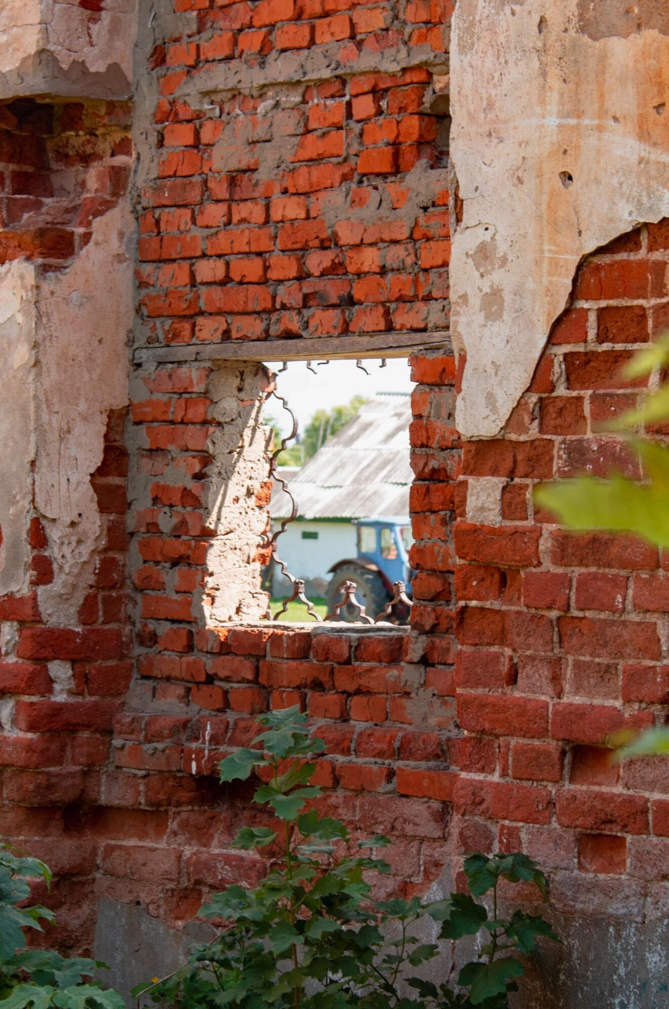 На представленной фотографии запечатлён скорбный, но исполненный неизбывной духовной силы вид частично разрушенной стены Георгиевского храма в селе Георгиевское, что под Ивановом. Сквозь арочный оконный проём, лишённый когда-то украшавших его витражей и переплётов, открывается вид на внутреннее пространство святыни и фрагменты иных строений, поросшие дикой растительностью. Кирпичная кладка, помнящая прикосновения рук благочестивых зодчих, ныне предстаёт в своей неприкрытой временем строгости, свидетельствуя о былом величии этого места.