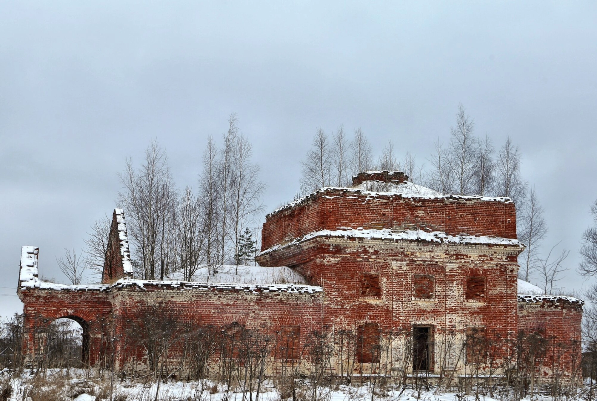 На представленной фотографии запечатлены скорбные останки Георгиевской часовни, расположенной в деревне Седельницы Ярославской области. Святыня, некогда освящённая в честь великомученика Георгия Победоносца, ныне пребывает в запустении и разрушении.
